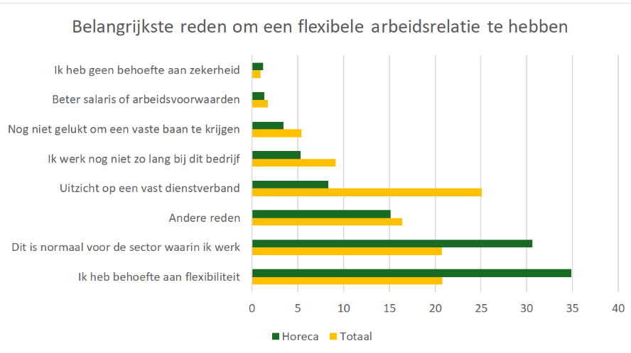 In de horeca is het aandeel jongeren en flexibele arbeidsrelaties groot: ruim 63 procent werkt flexibel, waaronder 44 procent als oproepkracht. Uit de NEA 2024 blijkt dat 35 procent van de horecawerknemers flexibiliteit prettig vindt, en een derde dit normaal vindt—beduidend meer dan het gemiddelde over alle sectoren (20,8 en 20,7 procent). De behoefte aan flexibiliteit is het grootst in de bediening (41 procent), gevolgd door koks en keukenhulpen (32 procent).