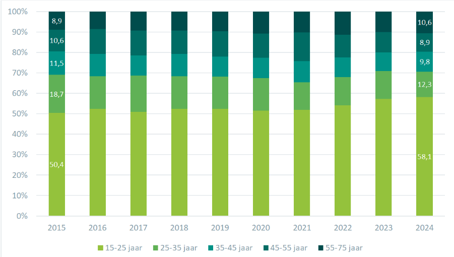 Toch daalt het aandeel 25–35-jarigen in de horeca: van bijna 19 procent in 2015 naar 12 procent in 2024. In het bedrijfsleven als geheel blijft dit rond de 20 procent. De lage uitstroomleeftijd van gemiddeld 25,1 jaar wijst erop dat jongeren na hun opleiding vaak niet in de sector blijven.