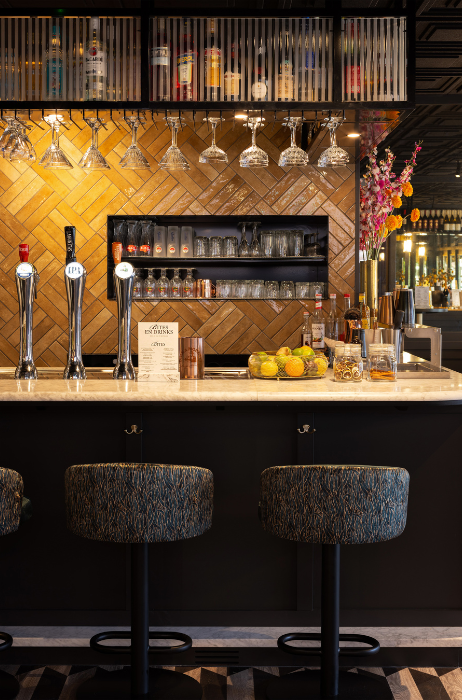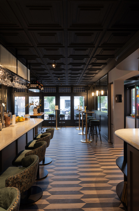 Designer Jeroen Smeele: "Al brainstormend kwam de formule van een ‘restobar’ ter sprake: de mogelijkheid om te borrelen met goede wijnen en cocktails, een menukaart met hoogwaardige bites en gerechten en een laagdrempelige, ongedwongen sfeer."