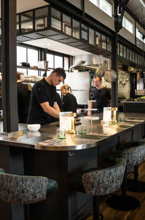 De eyecatcher in het restaurantgedeelte is de enorme chef’s table, die volgens de eigenaren zeer in trek is bij de gasten. De kaart heeft een Franse basis met gerechten zoals coquilles en steak tartare en het signature dessert Mosa’s Mini Magnum. Achterin de ruimte is de private dining. Opvallend is de stalen boogconstructie uit het oude treinstation van Gent, en de industriële uitstraling.