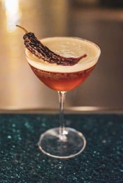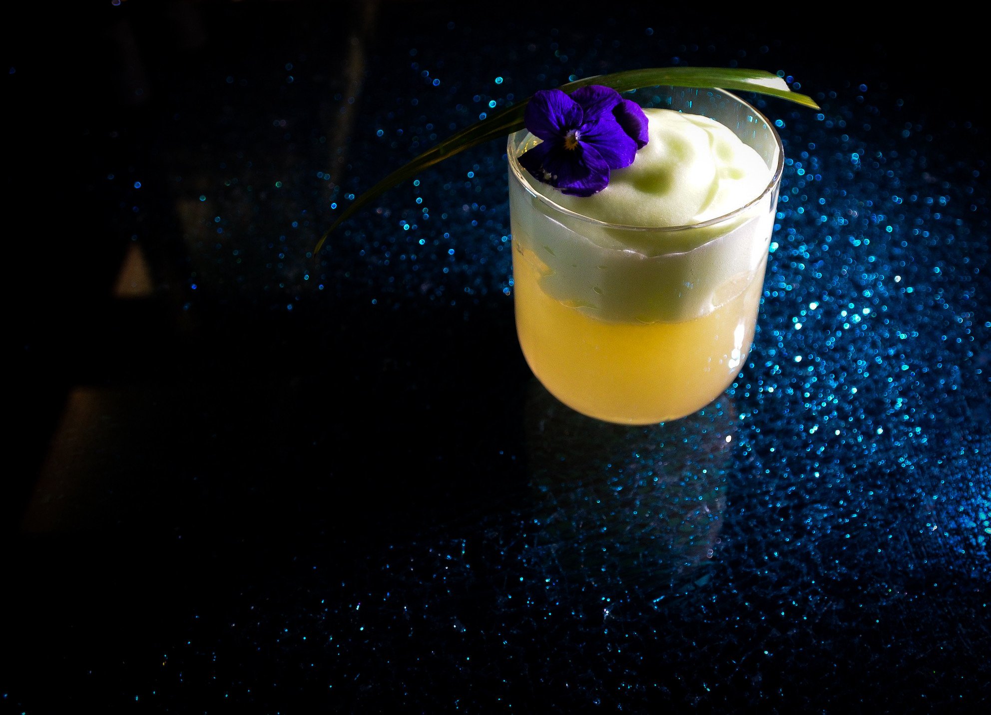 - Top de cocktail met huisgemaakt pandanschuim (pandan, groene thee, suikersiroop, pro espuma)