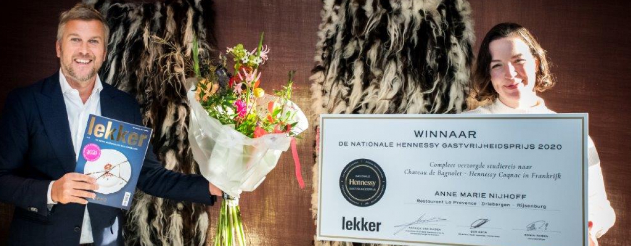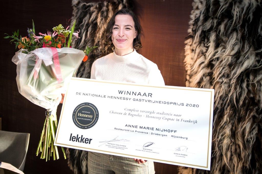 Anne Marie Nijhoff (25) van restaurant La Provence* in Driebergen is de winnaar van de negentiende editie van de Nationale Hennessy Gastvrijheidsprijs 2020 en mag zich de beste jonge gastvrouw van Nederland noemen. De uitreiking vond dit jaar digitaal plaats, tegelijkertijd met de lancering van Lekker500 2021.