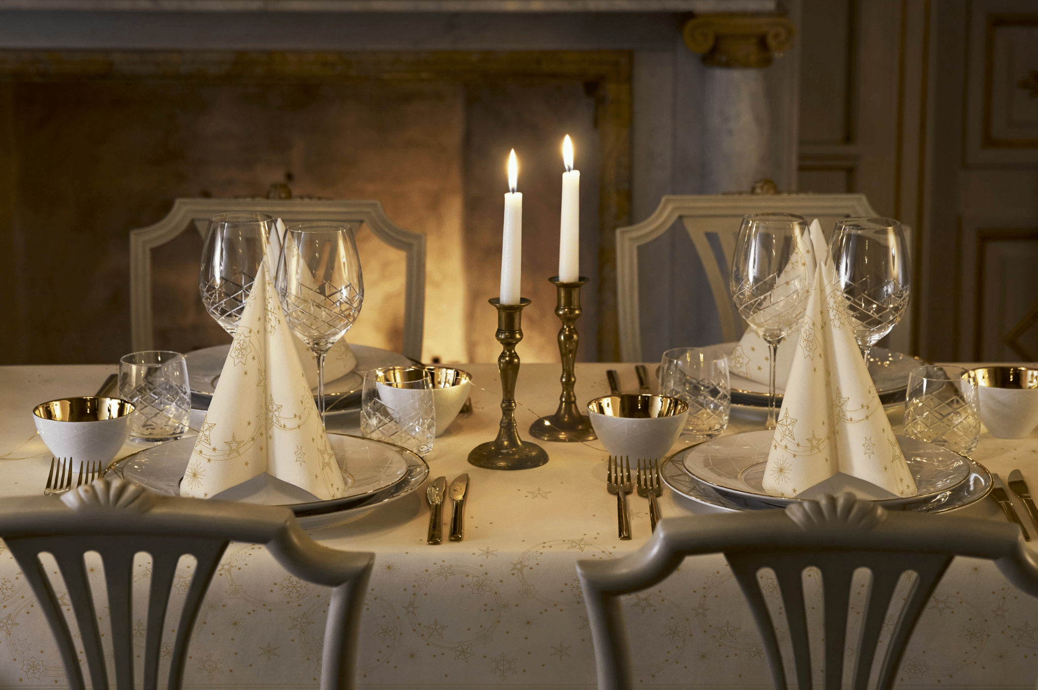 Ga bijvoorbeeld voor de Star Shine Cream collectie van Duni Benelux. De neutrale crèmekleur van de servetten, placemats, tafellakens en tafellopers van deze collectie zorgt voor een luxe uitstraling. Gebruik subtiel gekleurde accessoires in wit, grijs en goud om de look af te maken.