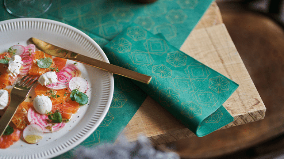 De servetten en tafellakens uit de collectie Gilded Star Green geven een diep, levendig en vorstelijk gevoel aan tafel. De uitgesproken kleur smaragdgroen zal de aandacht trekken. De combinatie van het smaragdgroen met gouden geometrische detaillering en kleurrijke gerechten op het bord zorgen voor een fris én feestelijke tafel.
