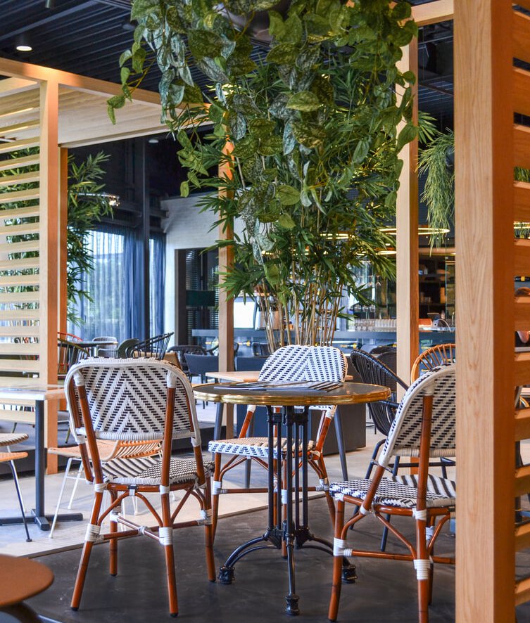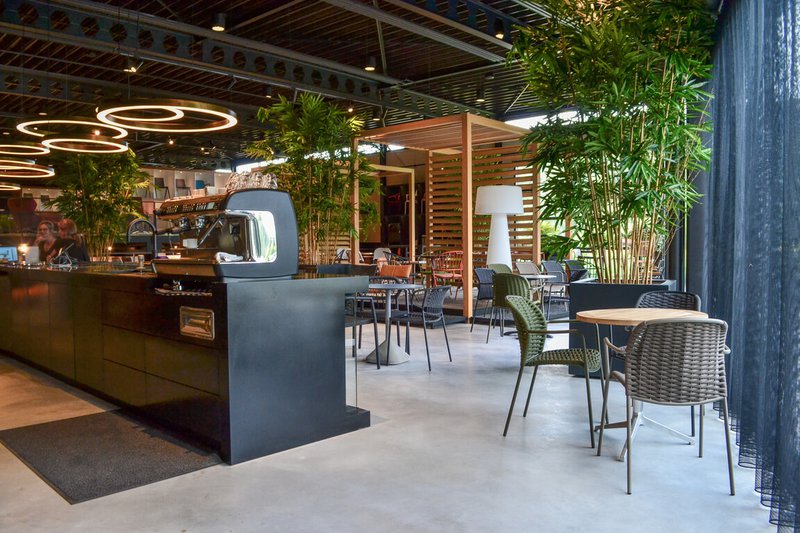 In de terrasshowroom wordt buiten meer met binnen geïntegreerd. Waar het meubilair voorheen chaotisch door de showroom stond, is er nu gekozen voor houten cabaña’s die zorgen voor een afscherming tussen de verschillende interieurstijlen. De bamboo planten accentueren de hoogte van het pand en zorgen voor een levendige sfeer. “Er is bewust gekozen voor een paar hoge planten in plaats van veel kleine, zodat de presentatie overzichtelijk wordt. Door te variëren in de maten doorbreek je de hoogte.” licht Stijns toe.