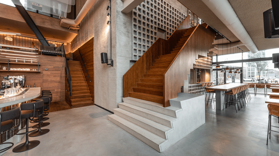 De makers van Pllek op de NDSM-werf in Amsterdam-Noord zijn een nieuw verhaal begonnen, NEXT. In een nieuwbouwpand aan het IJ hebben initiatiefnemers Sjoerd Steenbeek en Michiel de Vries, samen met ontwerpbureau TANK een kosmopolitisch moderne zaak neergezet waar gasten zich direct in New York of Londen wanen. Een modern all day-grandcafé 2.0, met livingroom, cocktailbar, lounge, restaurant en brasserie ineen.