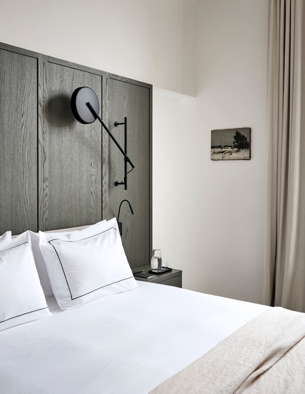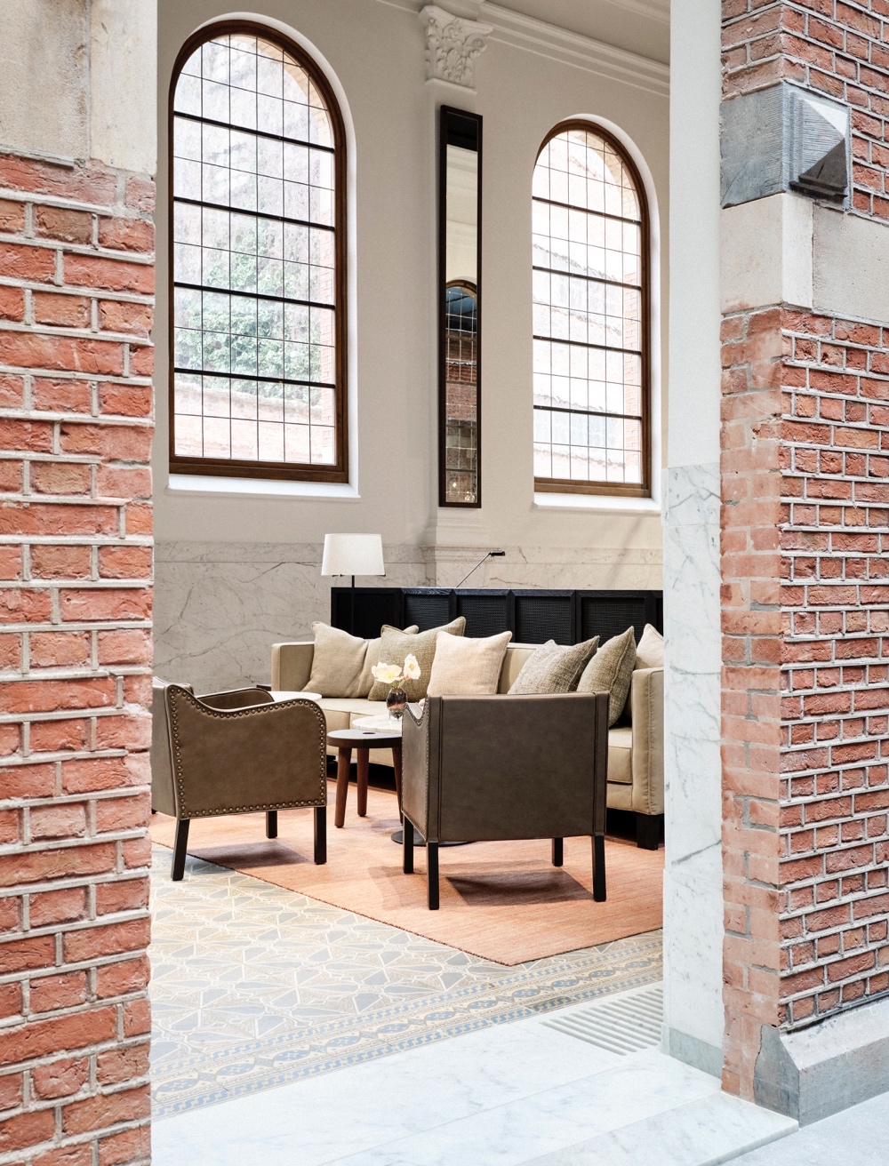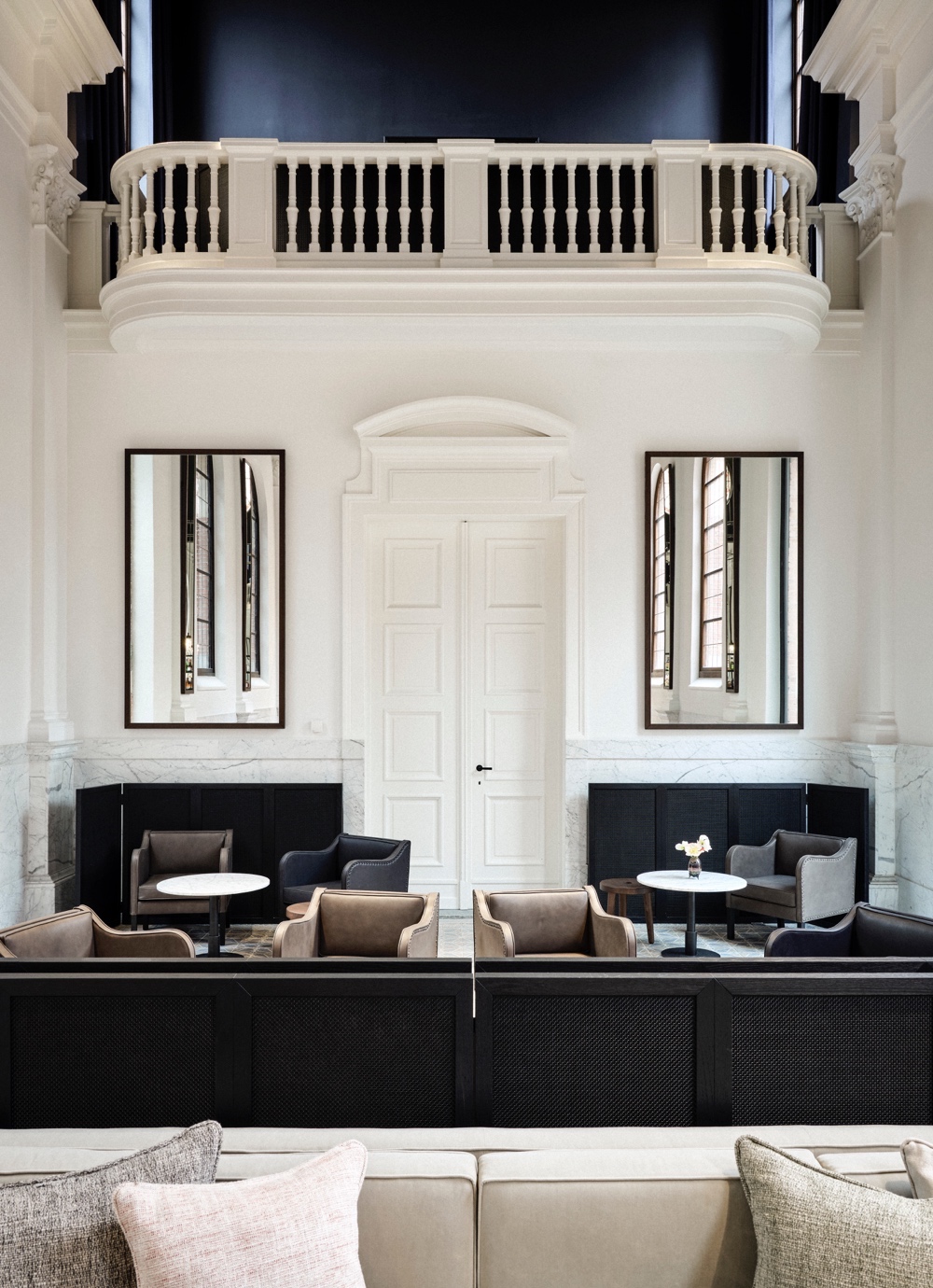 Het interieur is opgevat als een warm en tijdloos eerbetoon aan het kloosterleven. Bij elke stap die je zet, treed je in contact met een zorgvuldig uitgedachte esthetiek. Elk element is zo ontworpen dat het perfect opgaat in het authentieke erfgoed met zijn moderne toetsen. De complexe patronen van de originele tegelvloeren werden gerestaureerd en teruggeplaatst, als getuigen van een nieuwe, glorieuze setting. Door de enorme ramen stroomt een overvloed aan natuurlijk licht naar binnen, wat een prachtig contrast vormt met het gesloten karakter van de voormalige functie. Zo goed als alles wat je ziet in het interieur van August werd op maat ontworpen door Vincent Van Duysen, en gemaakt in samenwerking met onder andere Molteni, Flos en Serax.