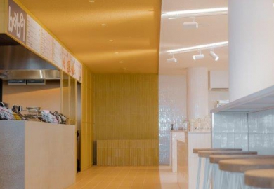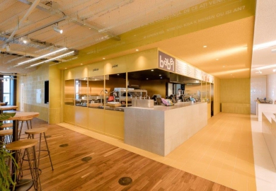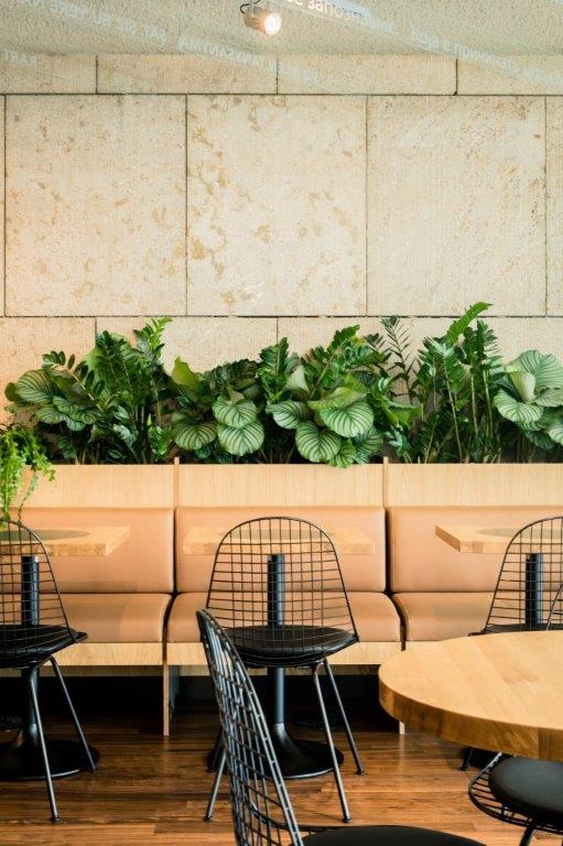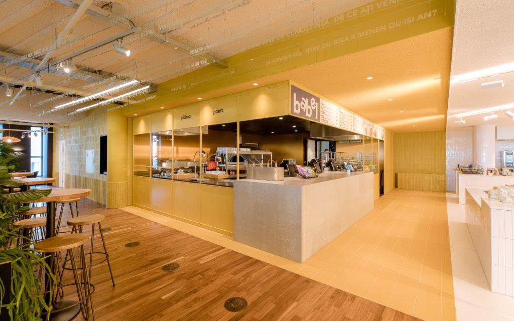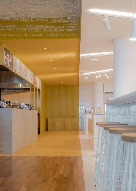 Het warme interieur van het restaurant-gedeelte vormt een sterk contrast met de centrale, witte zone. TANK koos voor riante banken en grote tafels zodat bezoekers altijd een meubelstuk delen. De overdaad aan bakstenen die de wanden bekleden is een subtiele knipoog naar de stijl van de Amsterdamse school. De diep-gele kleur die de keuken accentueert is een referentie naar de kleur van nieuwsgierigheid en creativiteit.