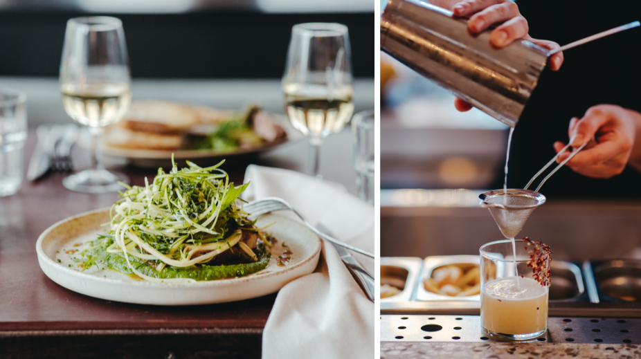 Naarmate de dag vordert wordt de ruimte opgesplitst in een restaurant en een bar. In het restaurant kunnen gasten genieten van een wereldse keuken – van zuurdesem flatbreads uit de steenoven tot wijting met krabjus en kokkels als hoofdgerecht. Wat opvalt op de kaart zijn de halal gerechten: de kippenlevermousse, double smash cheeseburger en boerderijkip suprême.