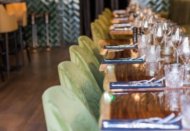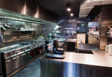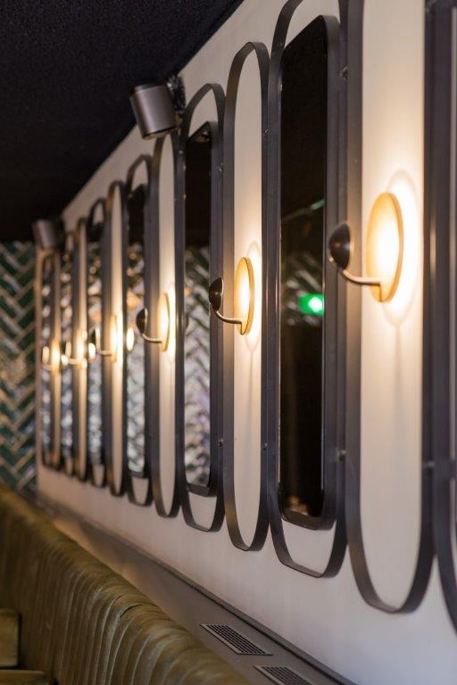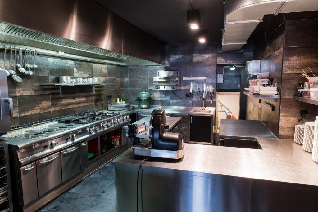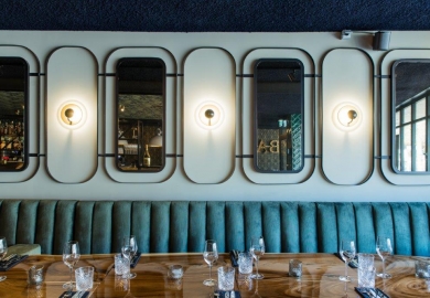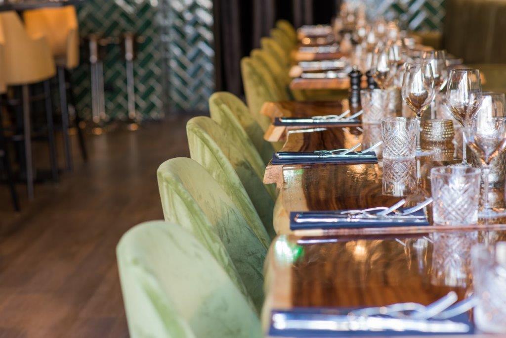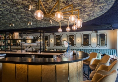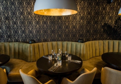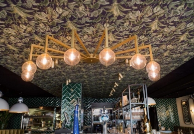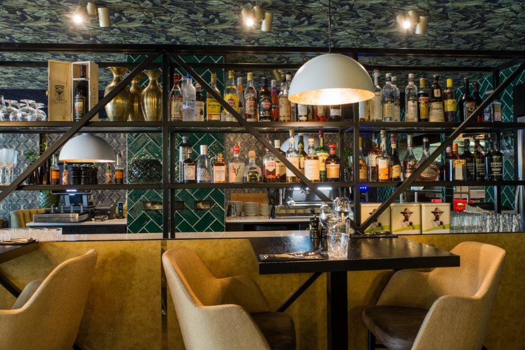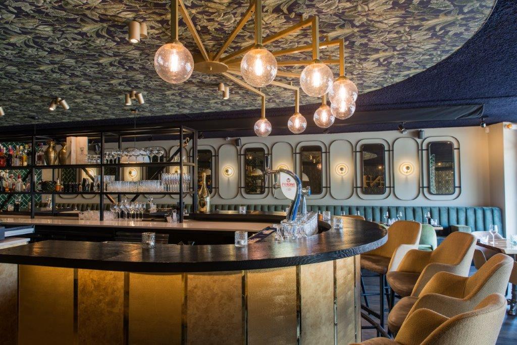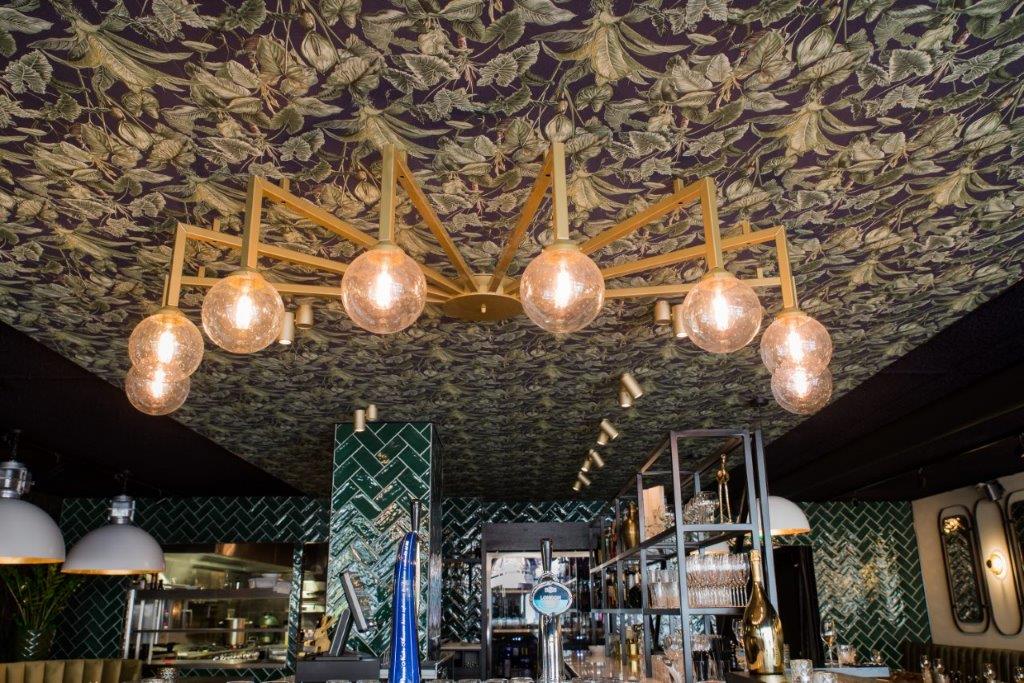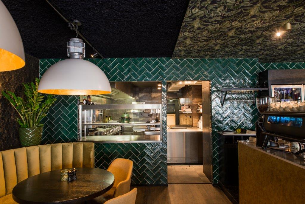 Opvallend zijn verder de centrale bar, de grote lampen boven de tafel en het plafond boven de bar. Dit is voorzien van een groen patroon met bloemen en planten en in het oog springende verlichting. Hierdoor 'breekt' de ruimte'. Door de open keuken krijgen gasten ten slotte een kijkje in de keuken, die overigens opvalt door het gebruik van donkere en chique tegels.