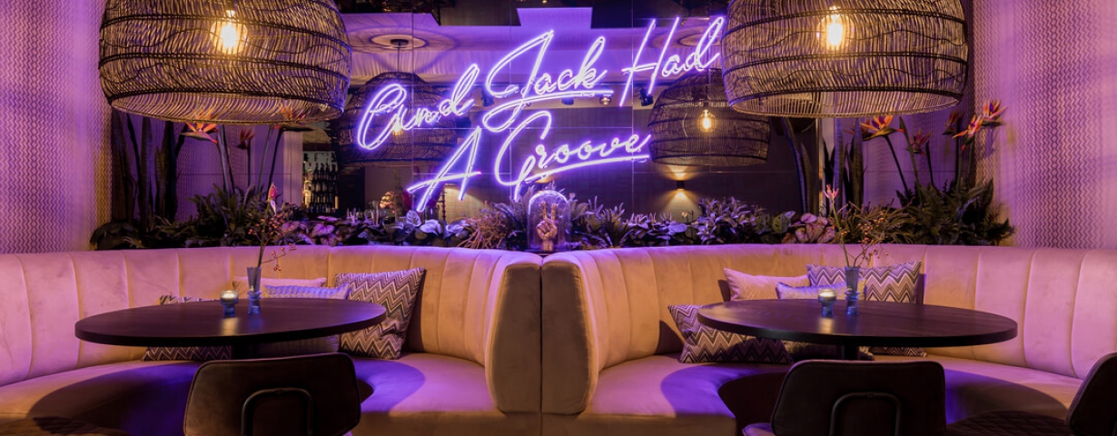 Een gewaagde muurschildering van een man en vrouw achterin de zaak, en twee enorme ronde banken met een knalpaarse neon waarop de tekst prijkt ‘And Jack had a groove’. Natuurlijk refererend aan de legendarische preek op de track ‘My House’ van house-pionier Chuck Roberts.