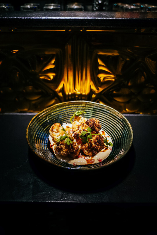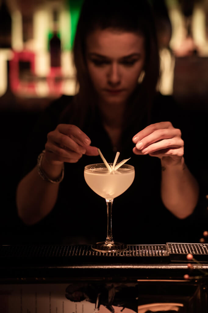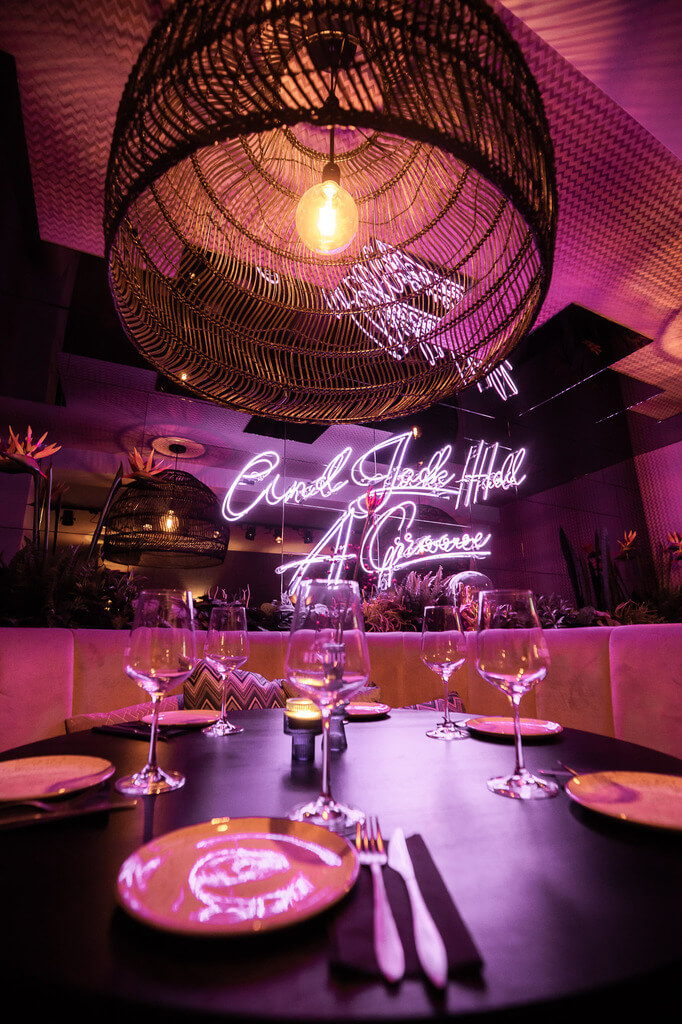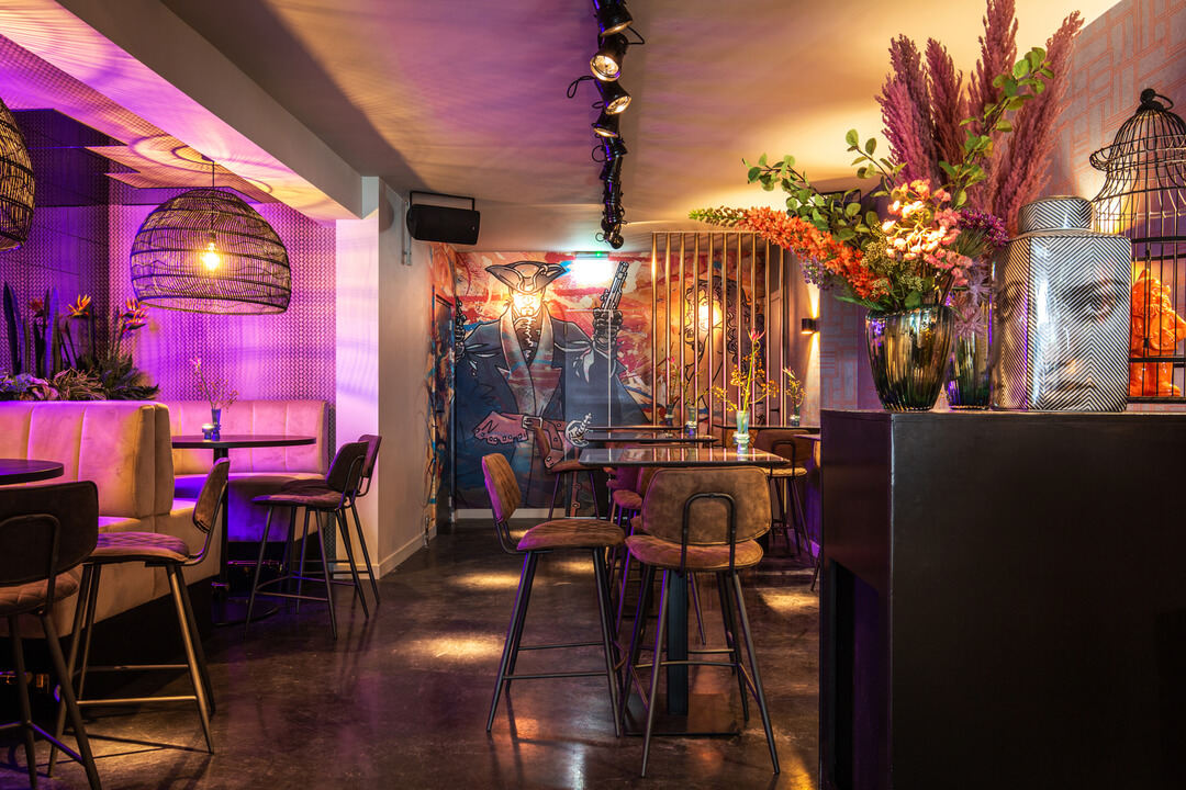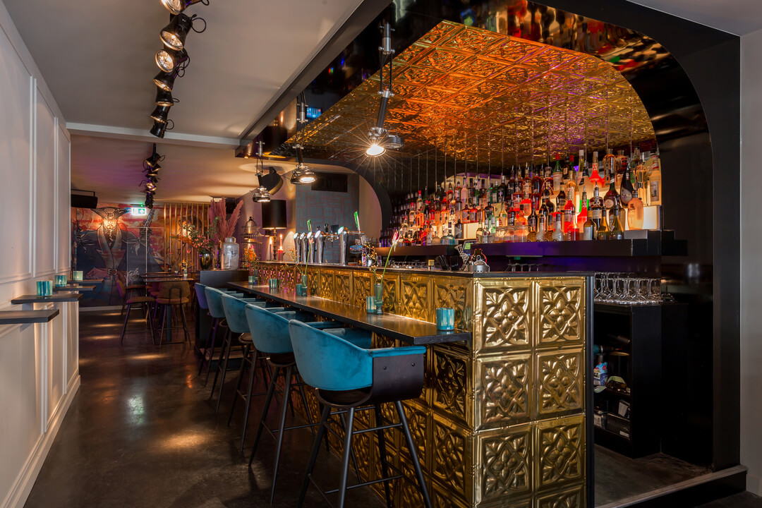 Het interieur heeft de echte wow-factor: fancy met een rebels randje. Zo is er de grote, glimmende gouden bar met een enorm aanbod aan gins, wodka’s en whiskeys. Een roze velours bank onder de takken van een grote, tropische boom.