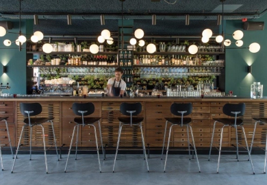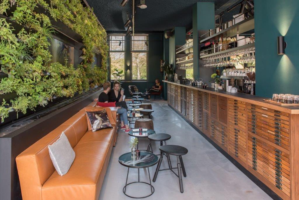 In het lounge-gedeelte achter de bar zit bovendien een aquaponics wand: een planten-muur met twee grote aquaria erin. Mooren: "Het is een oude techniek om kruiden en groenten te verbouwen en vissen te houden, waarbij de mest van de vissen meteen de voedingsstoffen voor de planten zijn. Dit circulaire systeem maakt het duurzame verhaal af."