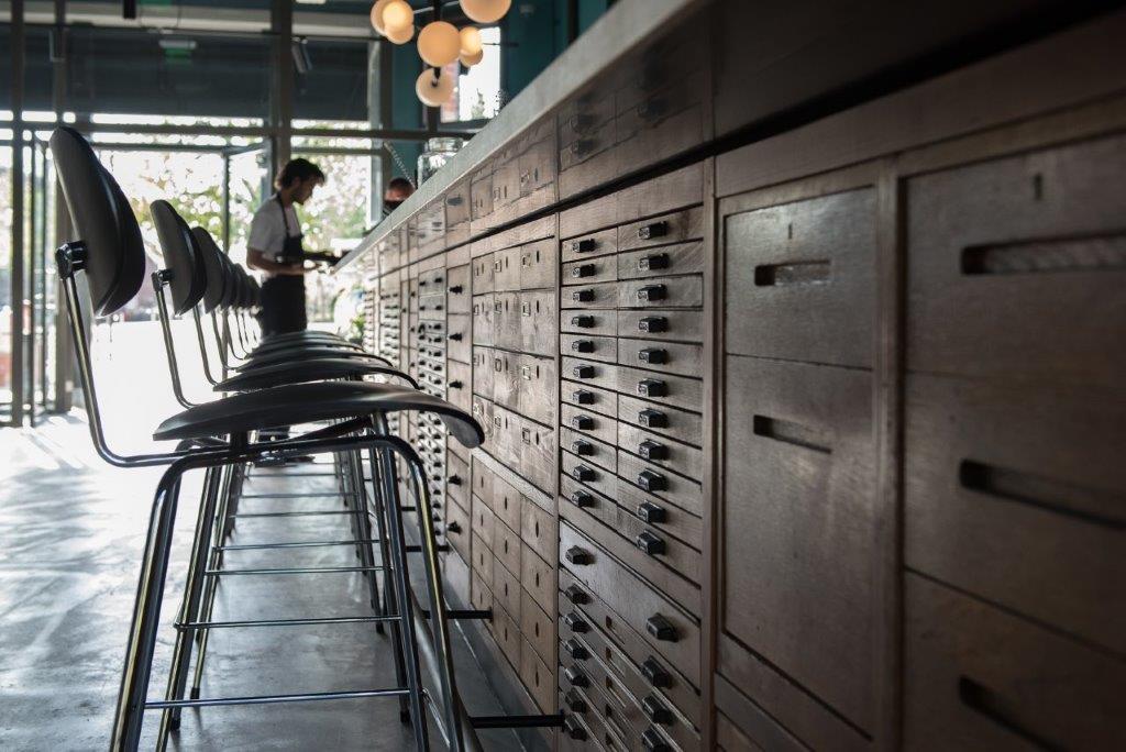 Bijzondere elementen van Bar Kantoor zijn de lange bar, die is gemaakt van gerecyclede bureaulades, en het in het oog springende kunstwerk aan het plafond. De nodige kantoorgrapjes op o.a. de menukaart en bij de presentatie van de rekening maken het geheel extra speels.