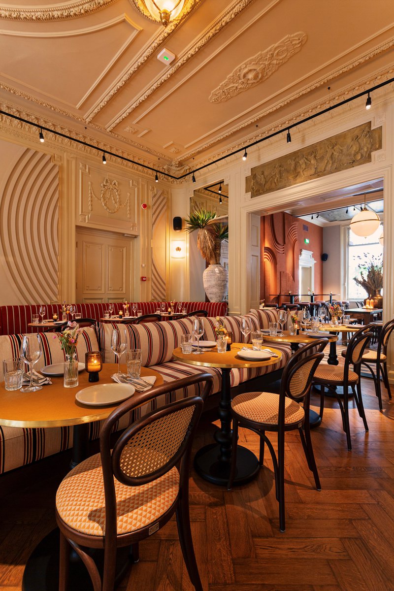 Druk op tafel, dus rustig in het interieur, aldus de twee ondernemers. “De kleuren en materialen zijn natuurlijk en puur. Dit resulteert in een ingetogen stijlvolle inrichting. Samen met de originele details uit het pand, mixt dit net als de gerechten modern met traditie, maar op een verfijnde manier. Ook aan de buitenlucht is gedacht, het marktgevoel van de Carmel Market wordt doorgetrokken in de ruime binnentuin, de hidden gem van Utrecht.”