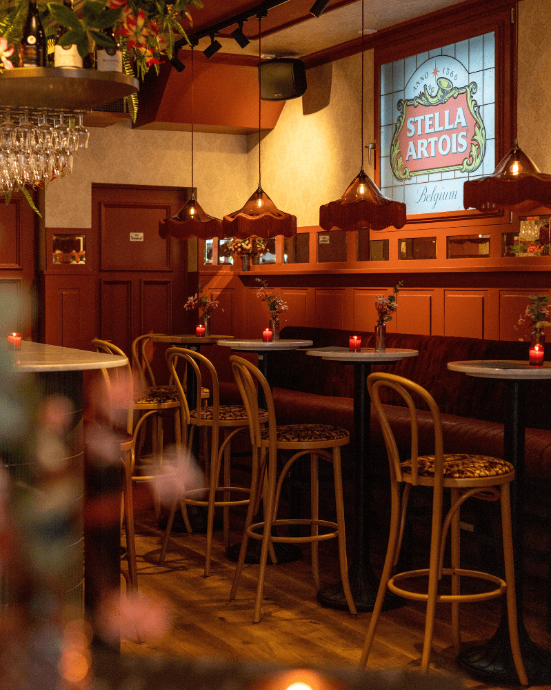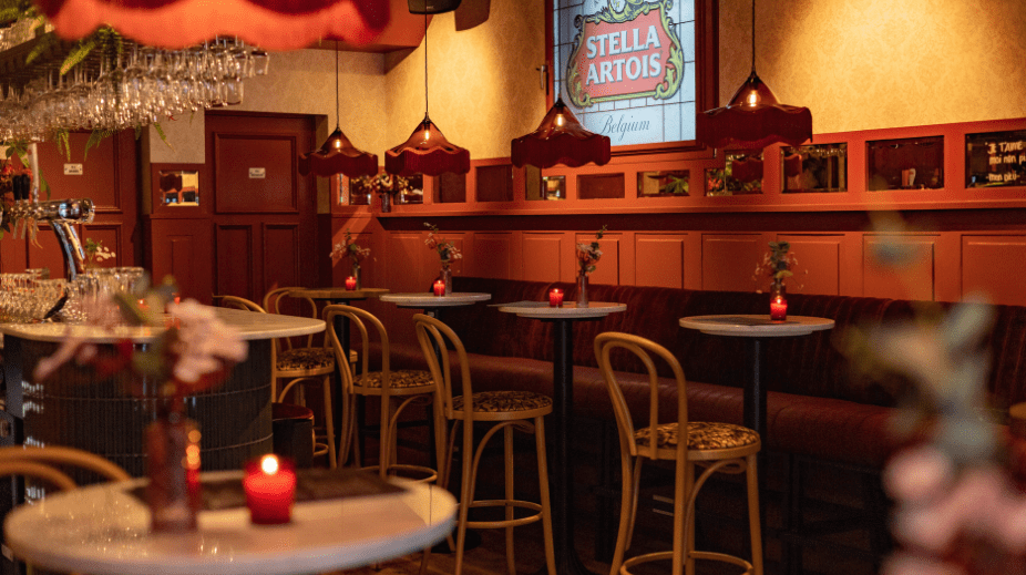 Horeca Sfeermakers richtte de gastrobar helemaal in volgens de Parijse stijl. Zo kreeg Mon Dieu een wit-rode inrichting, marmeren tafel- en barbladen en Franse barkrukken met fluwelen details. De uitkomst? Een elegant ogende zaak met een knusse en warme inrichting.