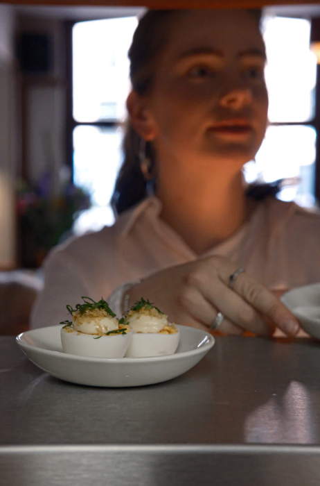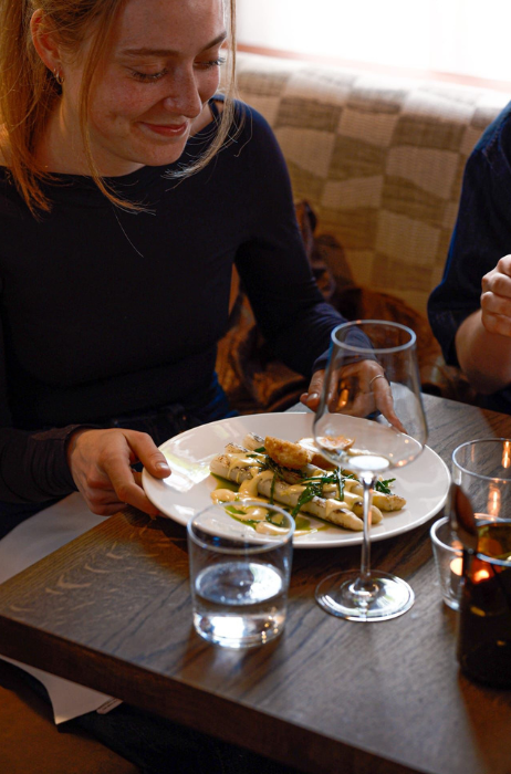 Voor wie uitgebreider wil dineren is er ook genoeg keuze tussen spannende maar toegankelijke gerechten, zoals geroosterde doperwtjes met eidooier, tomatillo en olijf of rode mul met bisque en antiboise.