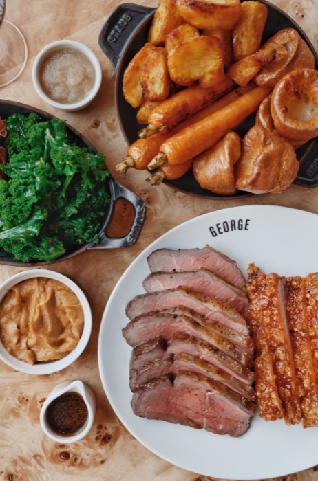 Op de kaart staan onder andere steak tartare, salade met Roquefort en peer (afbeelding links), gegrilde prei met mosterdvinaigrette, en een Sticky Toffee Pudding gebaseerd op een familierecept. Bekende George-specials ontbreken niet, zoals de Pizza Tuna. Daarnaast serveert de brasserie wekelijks wisselende gerechten, waaronder Fish & Chips op woensdag en een Sunday Roast (afbeelding rechts) op zondag, een traditioneel Brits gerecht met geroosterd vlees, aardappelen, jus en groenten.