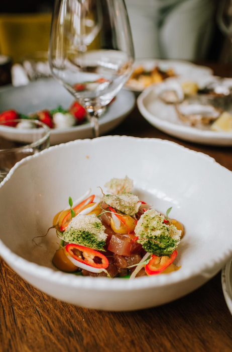 De menukaart biedt zowel à-la-cartegerechten als shared dining hapjes. Van oesters en tonijn tataki tot auberginesaté en entrecôte: de kaart heeft een brede selectie gerechten voor vega-, vis- en vleesliefhebbers. Voor degenen die niet kunnen kiezen is er ook een chef’s menu, waarbij de chef je verrast