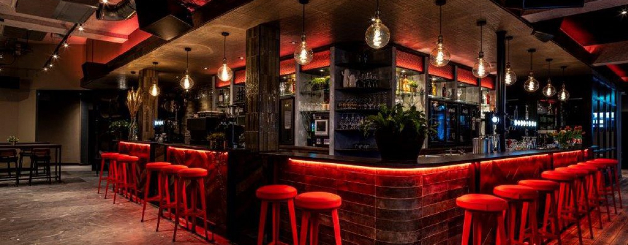 Designer Hans Kuijten vertelt: “Het hele pand is gestript en volledig naar deze tijd gebracht. Het interieur is met veel graffiti, staal, glas, betonnen vloeren en ruige materialen als hout en plaatmateriaal, gebaseerd op het streetlife gevoel. Om toch een warm en huiselijk gevoel te krijgen, gebruikten we verschillende stoffen en leersoorten. De fel rode krukken geven een lekker contrast met de rest. De Vermaekerij is klaar voor een bruisende toekomst!”