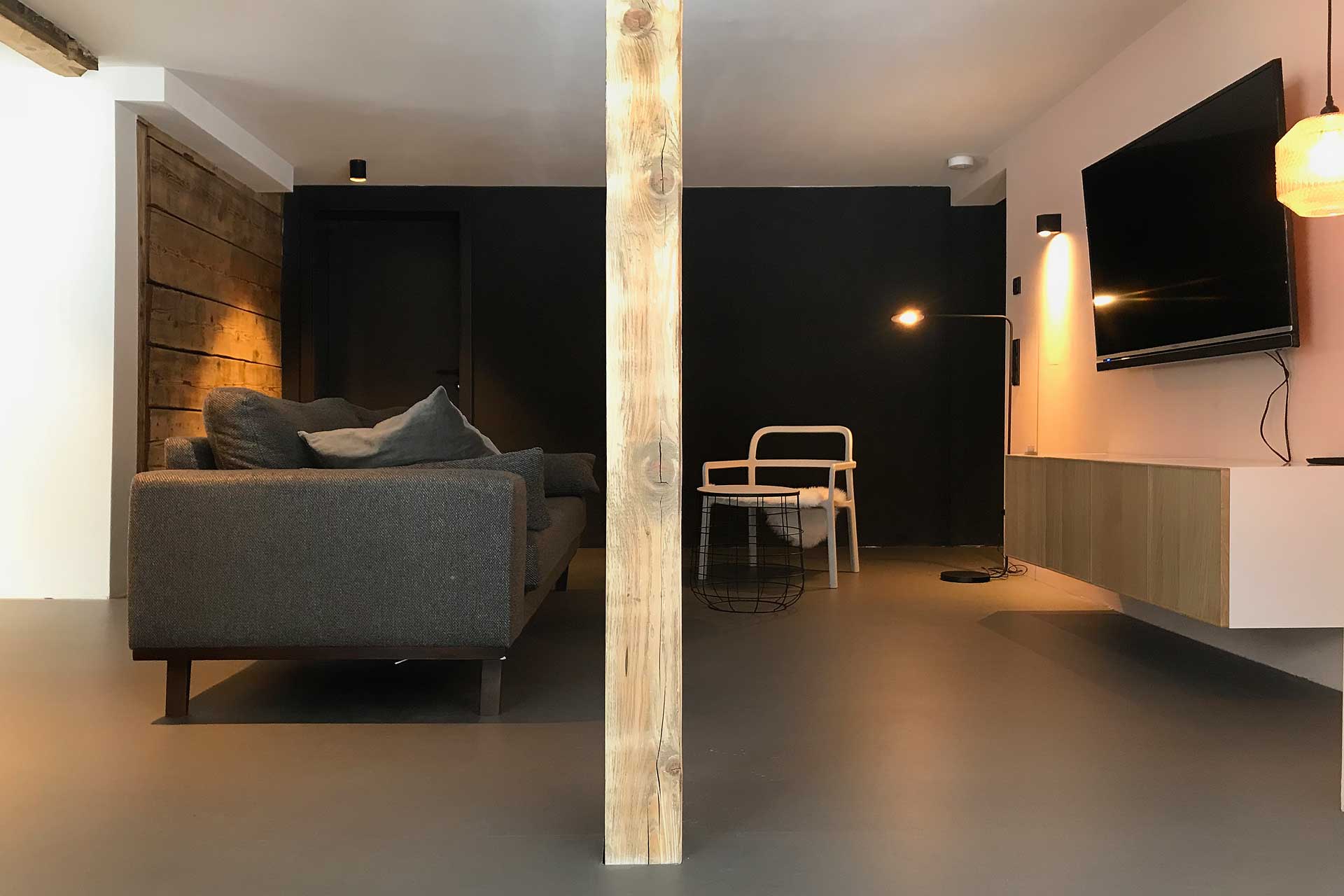 Tijdens de verbouwing kwamen de originele, houten draagwanden tevoorschijn. Deze geven de kamers en het gebouw een eigen en robuust karakter. De centrale ruimte met keuken, waar de gasten zelf kunnen koken, is grotendeels in zwart uitgevoerd.