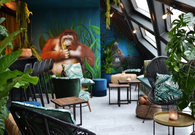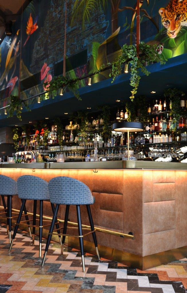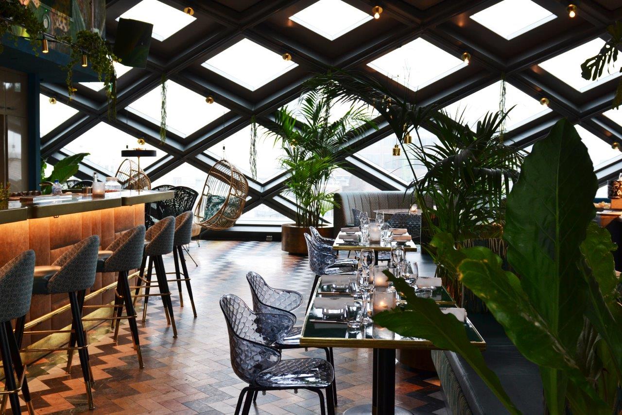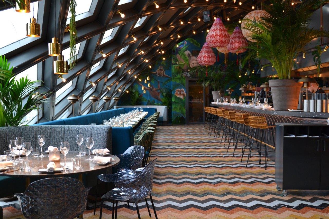 Downtown is geïnspireerd op de God en weduwe “Rangda”. Wanneer de avond valt en de muziek en het entertainment dynamischer wordt krijgt Rangda met haar vlammende tong, scherpe klauwen en demonisch rollende ogen, steeds meer moeite om de rust en harmonie in de Urban Jungle te bewaren. Met de ingang in de smalle steeg lijkt het op achteraf gelegen steegjes van Jakarta. De bar van Downtown heeft een spannende en uitgebreide verzameling cocktails, wijnen en gedestilleerd. De imposante stalen dakconstructie biedt uitzicht op een ware sterrenhemel van 275 lichtjes en over Amsterdam. HIP Studio is verantwoordelijk voor Concept, Design & Uitvoer.