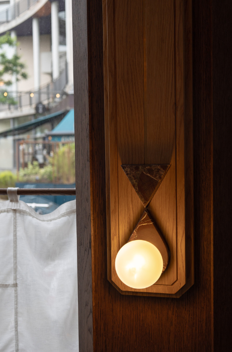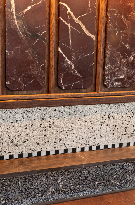 Net als de andere Fam. Goudvisch-zaken is het interieur van Leo ontworpen door Studio Modijefsky. Hout, marmer en andere natuurlijke materialen vormen de basis van het interieur, waardoor een uitnodigende sfeer ontstaat. De witte gordijntjes voor de ramen maken de knipoog naar de bruine kroeg compleet.