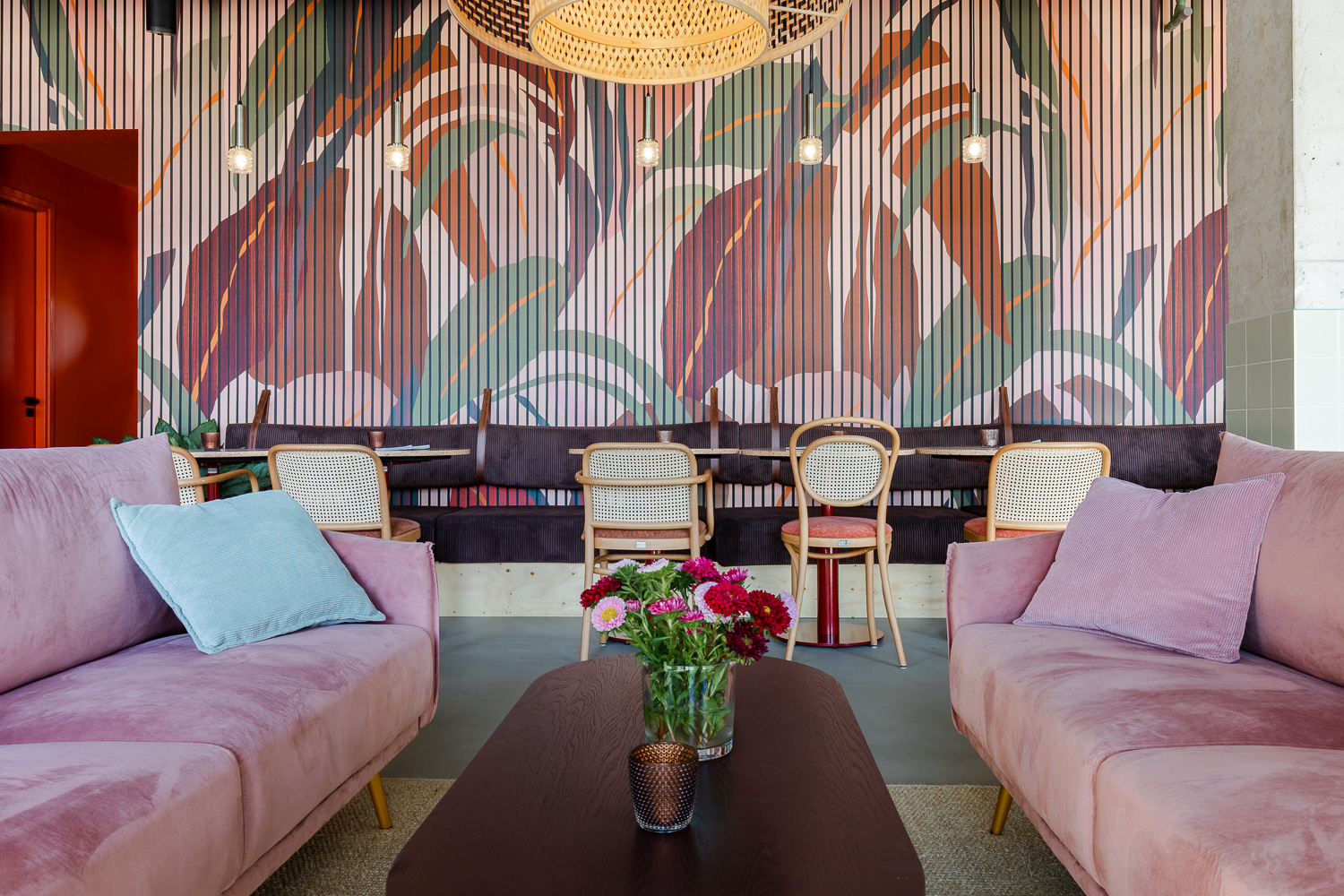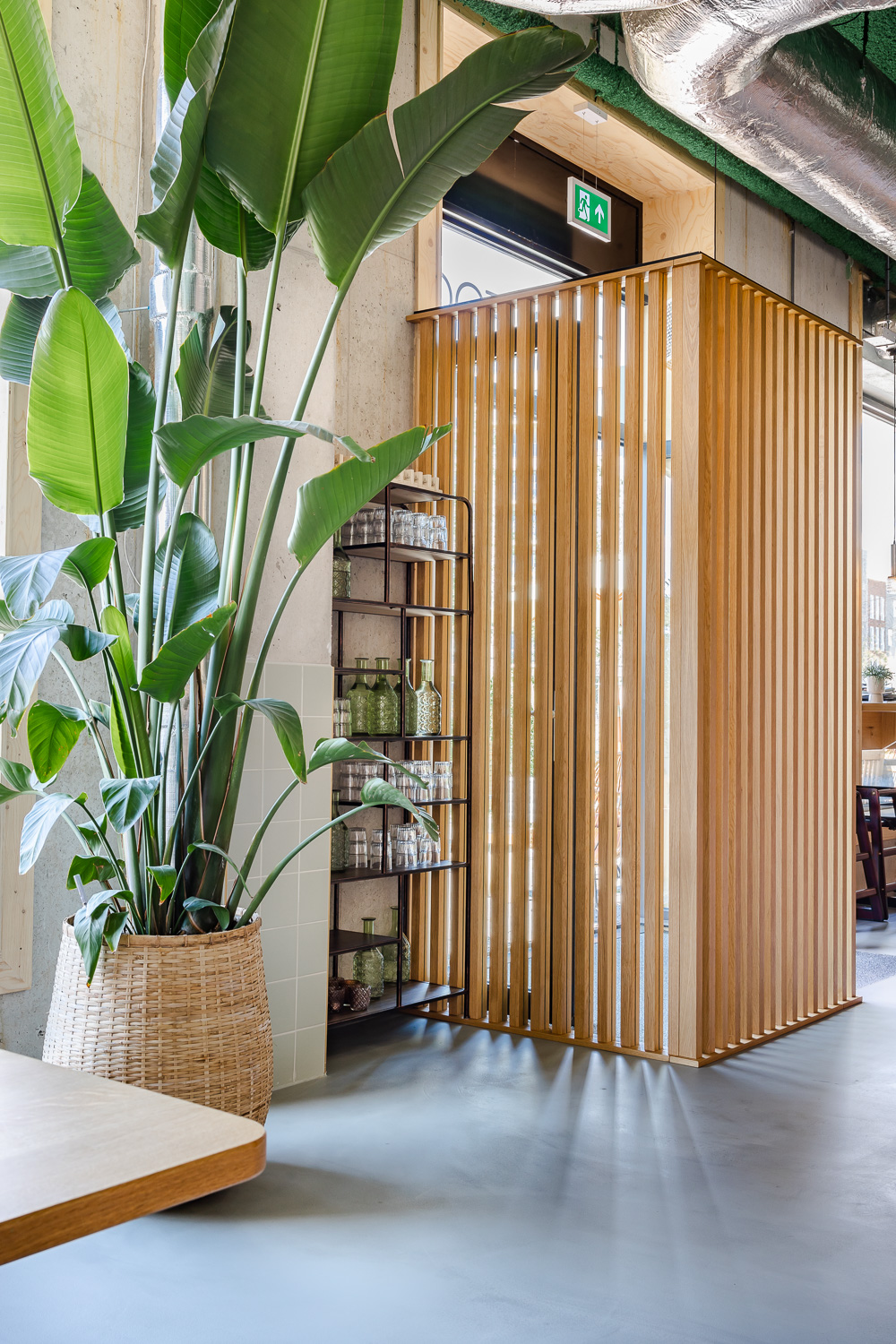 Het interieur van de foodbar is iets kleurrijker, maar tegelijkertijd verwant aan het design van de yogastudio. Je ziet duidelijk dat ze familie van elkaar zijn, want ook hier is gebruikgemaakt van natuurlijke materialen zoals hout, marmer, riet en bamboe.