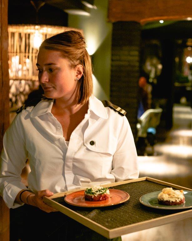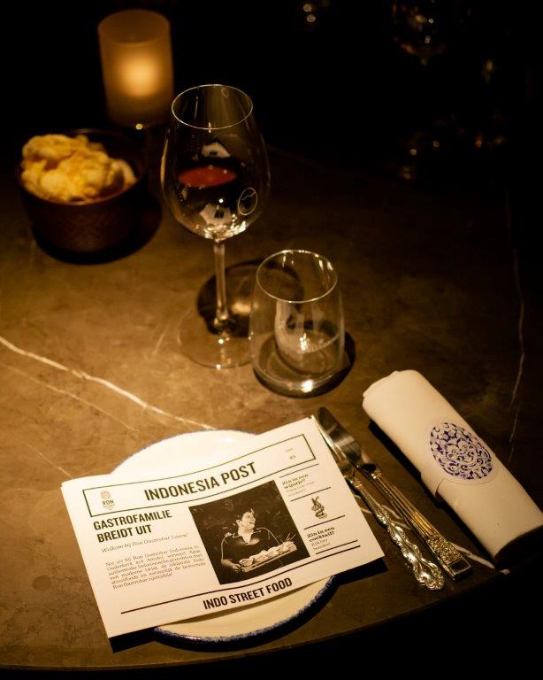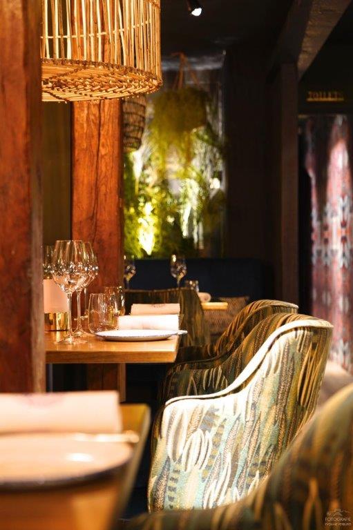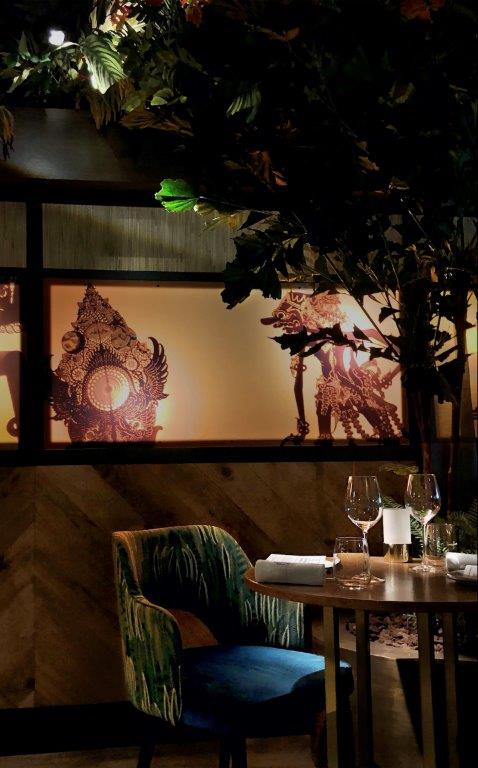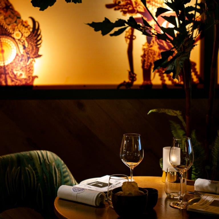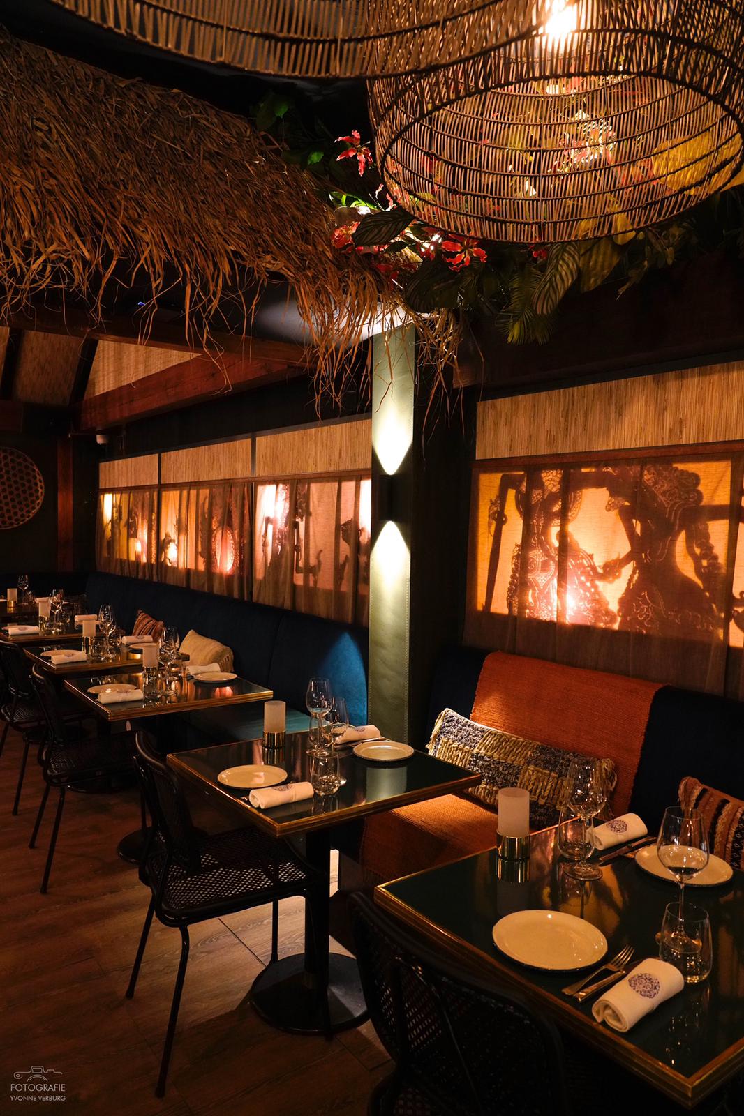 "Er zijn zeker overeenkomsten met de Gastrobar in Ouderkerk aan de Amstel, maar verschillen zijn er ook. Zo gaat dat bij familie. Bij deze inrichting hebben we meer klassieke Indonesische elementen en decoratie toegevoegd. Aangelichte wajangpoppen achter panelen, uitgevoerd in rijke stoffen, manden, potten en nog meer groen en bloemen bovenin de koof. Het is wat losser ingericht, haast als in een woonkamer. Wel een stijlvolle natuurlijk."