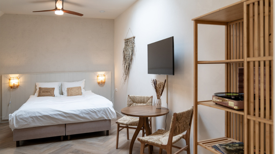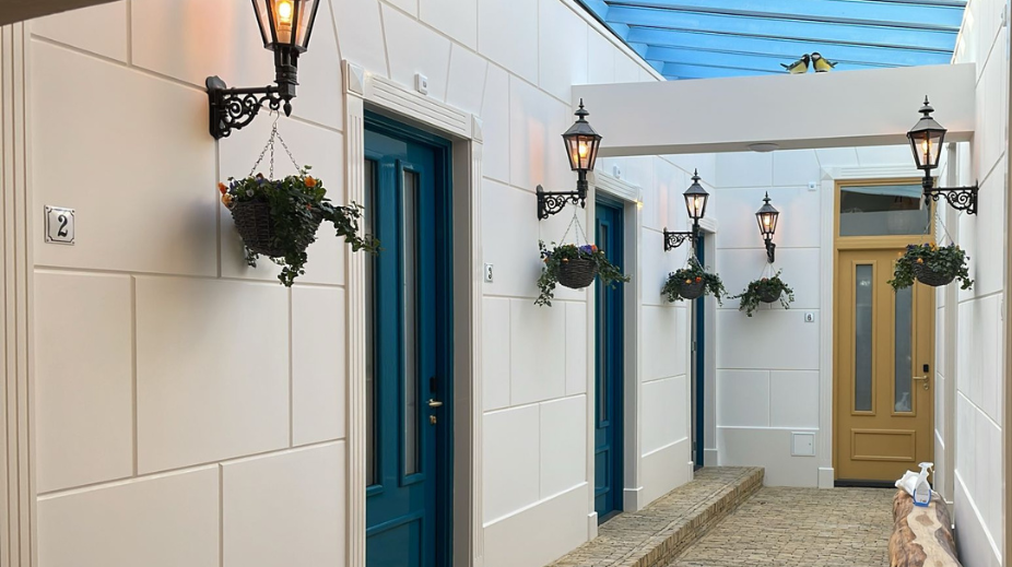 De originele halfronde, houten spantenconstructie in de nok, de échte boerengeeltjes op de muren van het binnenstraatje en de houten boogluiken voor de ramen zijn de eyecatchers van het nieuwe Grapèlli Boutique Hotel in hartje Alkmaar, dat begin maart de deuren opende. “Hier komen heden en verleden prachtig samen”, aldus de jonge ondernemer Reggie-Boy Rood (31).