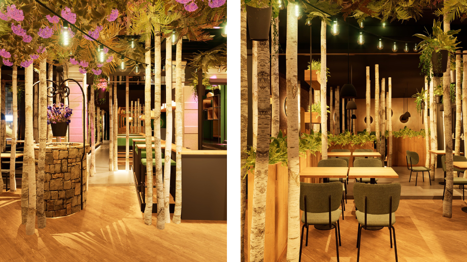 Het interieur van dit historische pand aan het Rembrandtplein straalt stijl en duurzaamheid uit. Het is een mix van moderne elementen en natuurlijke materialen, met veel hout, berkenstammen en subtiele verwijzingen naar het sprookje van Hans im Glück. Hoewel het interieur de naam van het restaurant eert, is het geen sprookjesconcept. In plaats daarvan biedt het een warme sfeer.