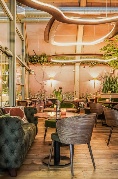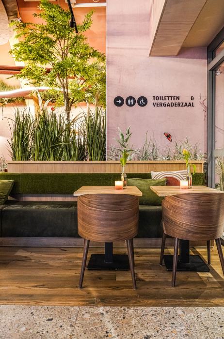 Naast het café zijn ook de vergaderzaal en de buitenuitgifte onder handen genomen. De akoestische wandprints creëren een rustgevende sfeer. De unieke styling en het gebruik van bijzondere materialen zorgt voor een frisse en eigentijdse uitstraling. De kleuren, zoals roze en groen, vormen samen een geheel en sluiten aan op de natuurlijke en groene omgeving waarin het duincafé gevestigd is.