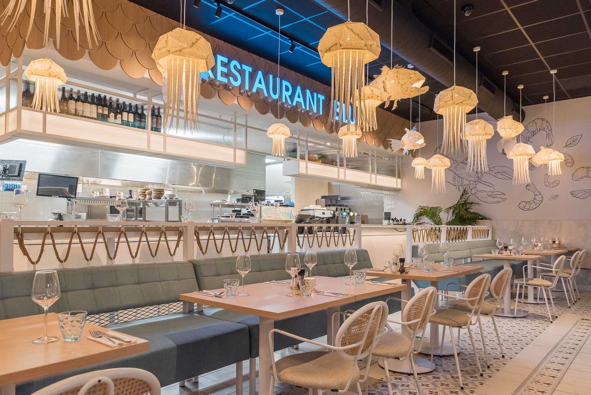 Kwallampen aan het plafond, visschubben aan de muren en veel wit- en blauwtinten: als er een interieur nautisch is, dan is het dat van Blu in Tilburg wel! Erik Remmers van Art2Go verzorgde het design en vertelt: "Het sfeervolle interieur sluit goed aan op het seafoodthema. Daarnaast komen in tegels met een speels patroon terug. Die zorgen voor een mediterrane sfeer." Eigenaar is Calvin Chen.