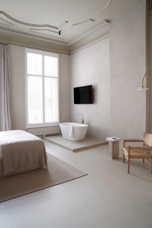 Het interieur wordt gekenmerkt door hoge plafonds en art nouveau-elementen, gecombineerd met Japanse en Scandinavische accenten. Juist die combinatie van historische, klassieke elementen met moderne, natuurlijke materialen en aardse kleuren is wat de eigenaren aanspreekt.