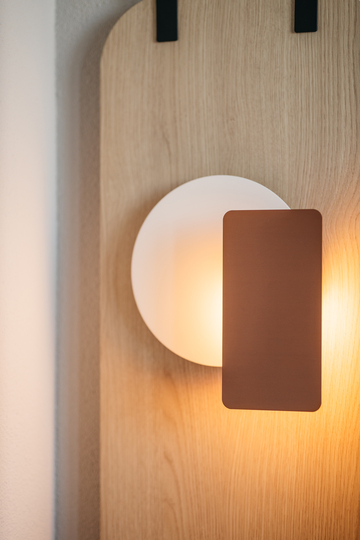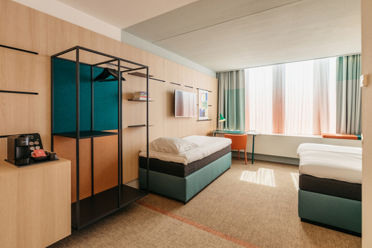 De dubbelfunctie van het hotel is terug te vinden in de kleinste details. Zo zijn kamers voorzien van een rails aan de muur: voor de hotelgast hangt hier een print, maar de student kan hier juist persoonlijke foto’s plaatsen. Het hoofdbord van het bed is van vilt, zodat er met punaises ingeprikt kan worden en onder het bed zitten grote lades, die zorgen voor voldoende opbergruimte.
