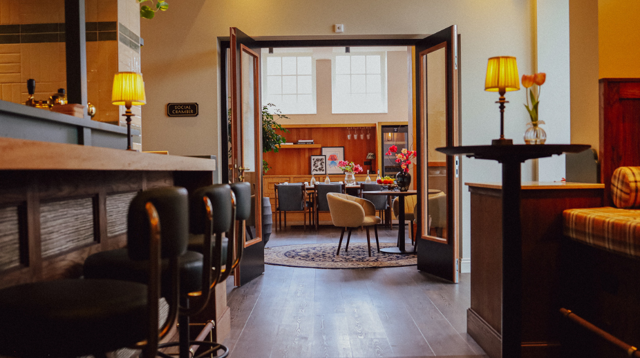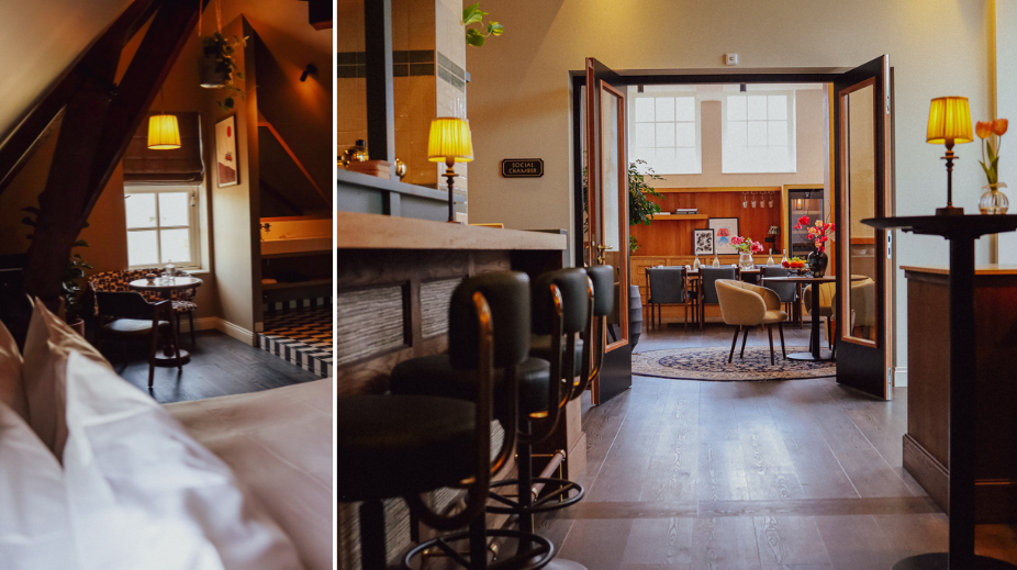 Designbureau King Kongs is medeverantwoordelijk voor de inrichting. "Op de begane grond van het hotel vinden we de Living Room", zegt Martijn Gosen. "Hier bevinden zich de receptie, living en bar. Het interieur straalt een elegantie uit, waar vintage en eigentijds stadsgevoel samenkomen met een vleugje klassieke charme. Lichte kleurtonen worden omhelsd door zachte verlichting, terwijl patronen, detaillering en lokale kunst een vertrouwde en levendige atmosfeer creëren, waardoor elke ruimte een eigen karakter krijgt."