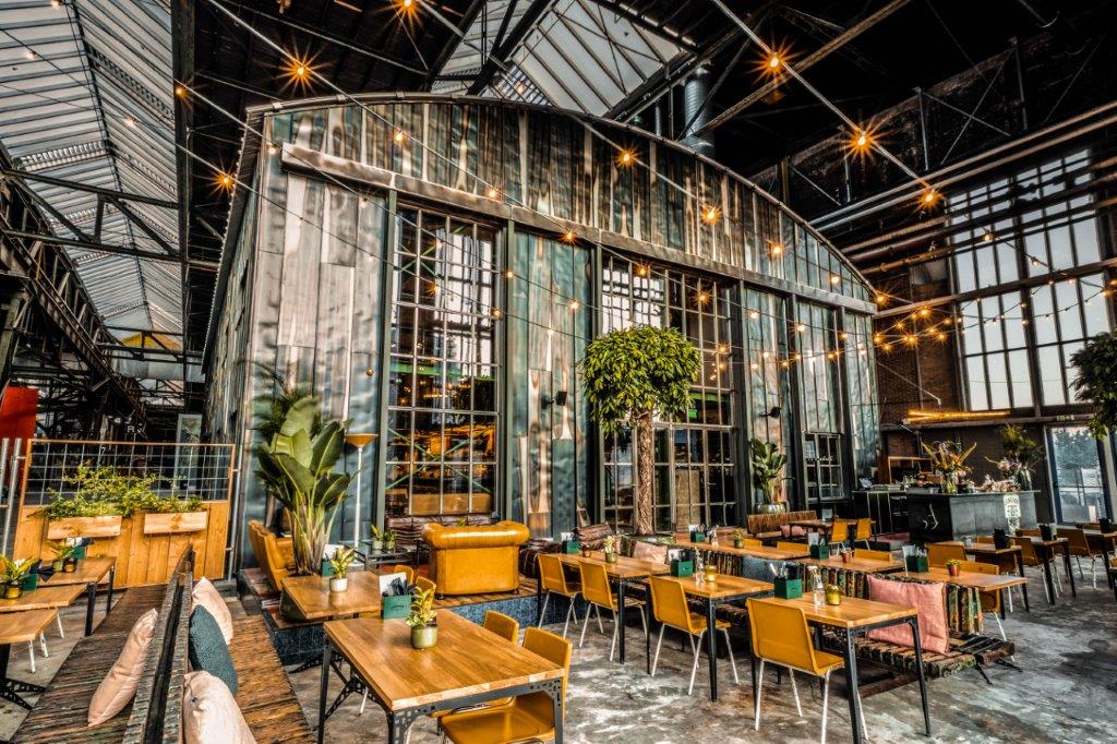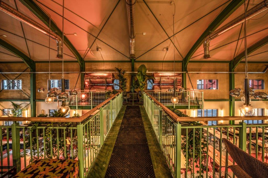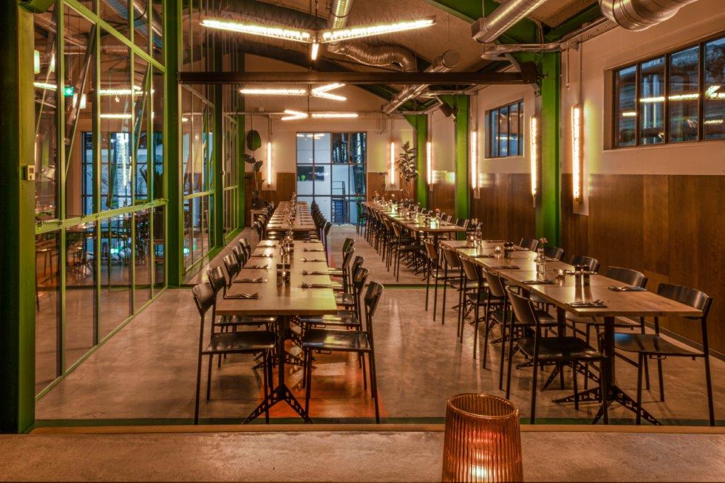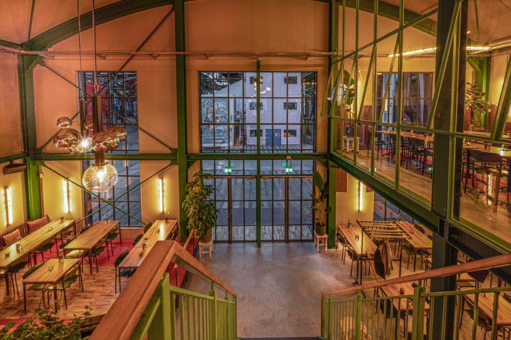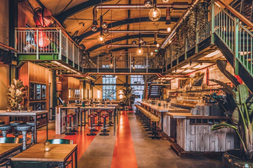 In de centrale loods is afgelopen jaar hard gewerkt aan een acht meter hoog restaurant met een groot terras. Ondernemers Reinout Ezinga, Sikko de Jong, Tim Jongens, Herman Klukkert en Arne Kleijn hebben samen met ontwerpers Adam Marshall en Teske Clijsen (Koelhuis Frigo) de authentieke en industriële elementen van het robuuste pand gecombineerd met felle kleuren, planten, comfortabel meubilair en bijzondere objecten. Voor een stoere uitstraling zijn de muren bekleed met koudgewalst staal dat handmatig met een gasbrander is bewerkt. De ruimte is flexibel ingedeeld waardoor er ook meetings, presentaties en feestjes van vijf tot vijfhonderd man kunnen worden gehouden.