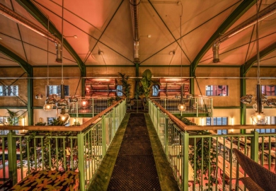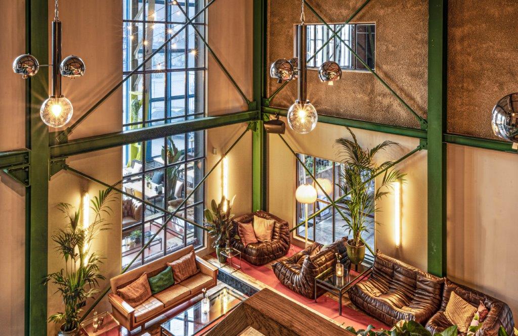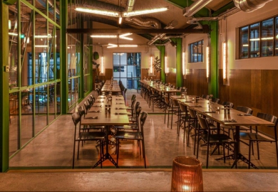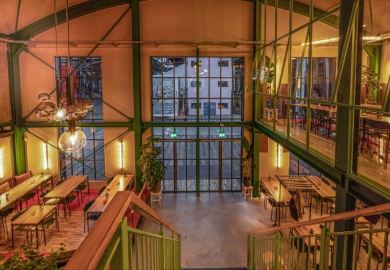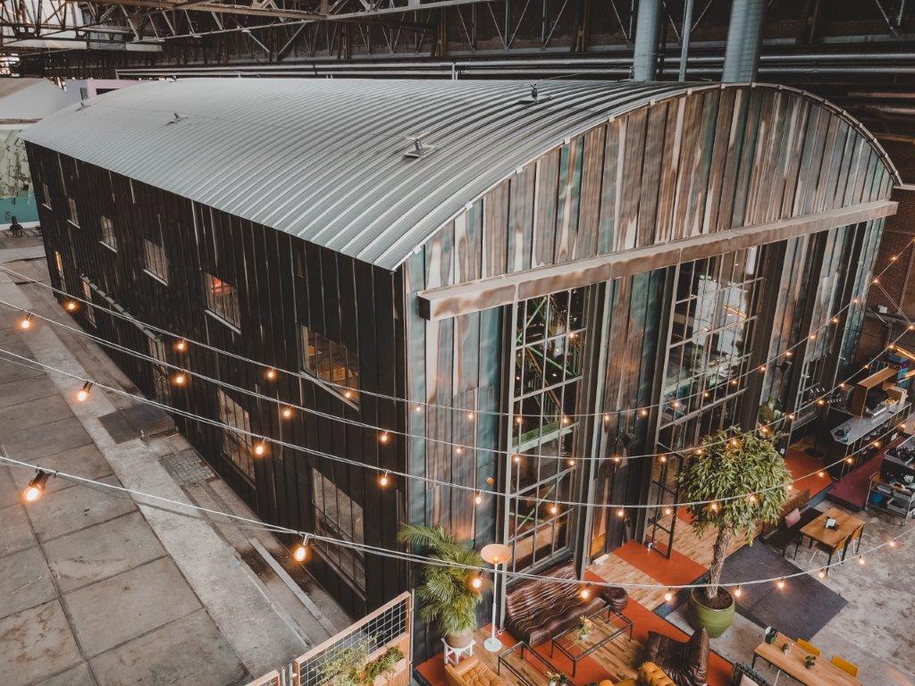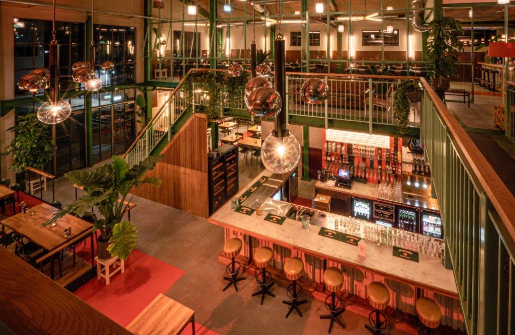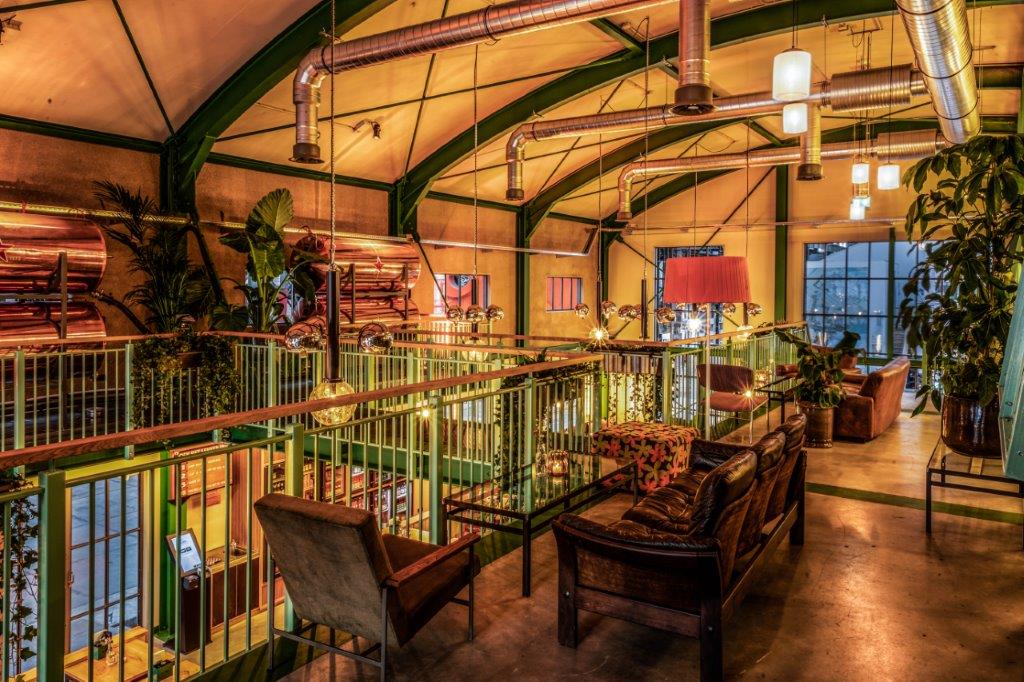 In de centrale loods is afgelopen jaar hard gewerkt aan een acht meter hoog restaurant met een groot terras. Ondernemers Reinout Ezinga, Sikko de Jong, Tim Jongens, Herman Klukkert en Arne Kleijn hebben samen met ontwerpers Adam Marshall en Teske Clijsen (Koelhuis Frigo) de authentieke en industriële elementen van het robuuste pand gecombineerd met felle kleuren, planten, comfortabel meubilair en bijzondere objecten. Voor een stoere uitstraling zijn de muren bekleed met koudgewalst staal dat handmatig met een gasbrander is bewerkt. De ruimte is flexibel ingedeeld waardoor er ook meetings, presentaties en feestjes van vijf tot vijfhonderd man kunnen worden gehouden.