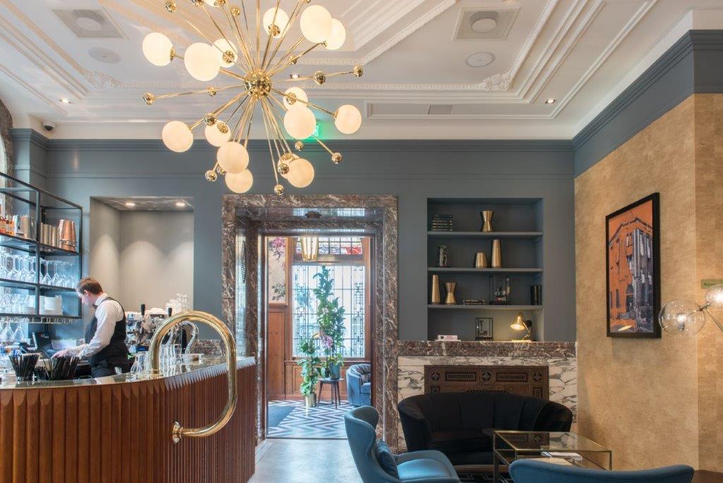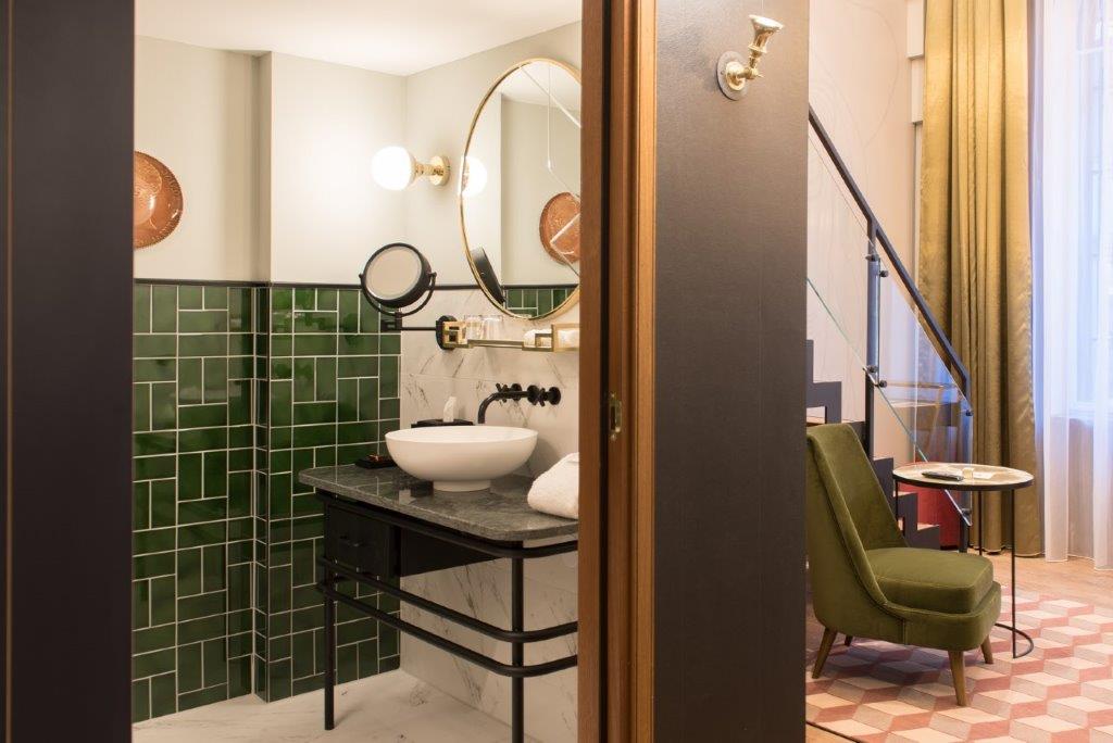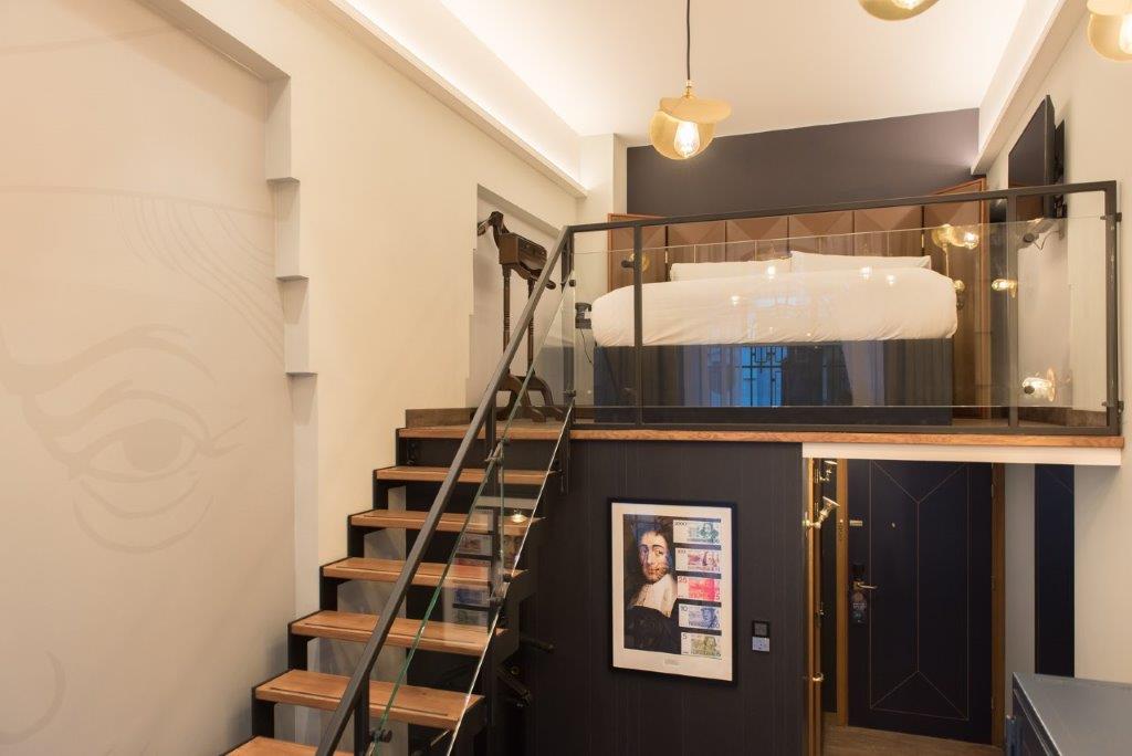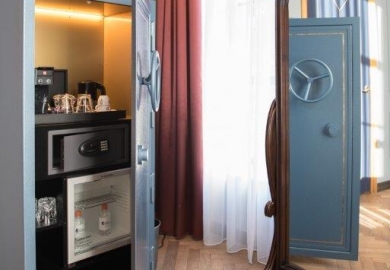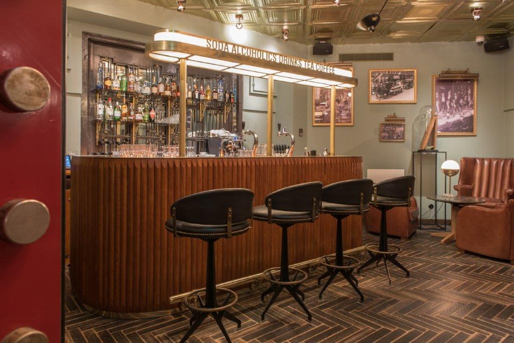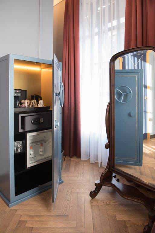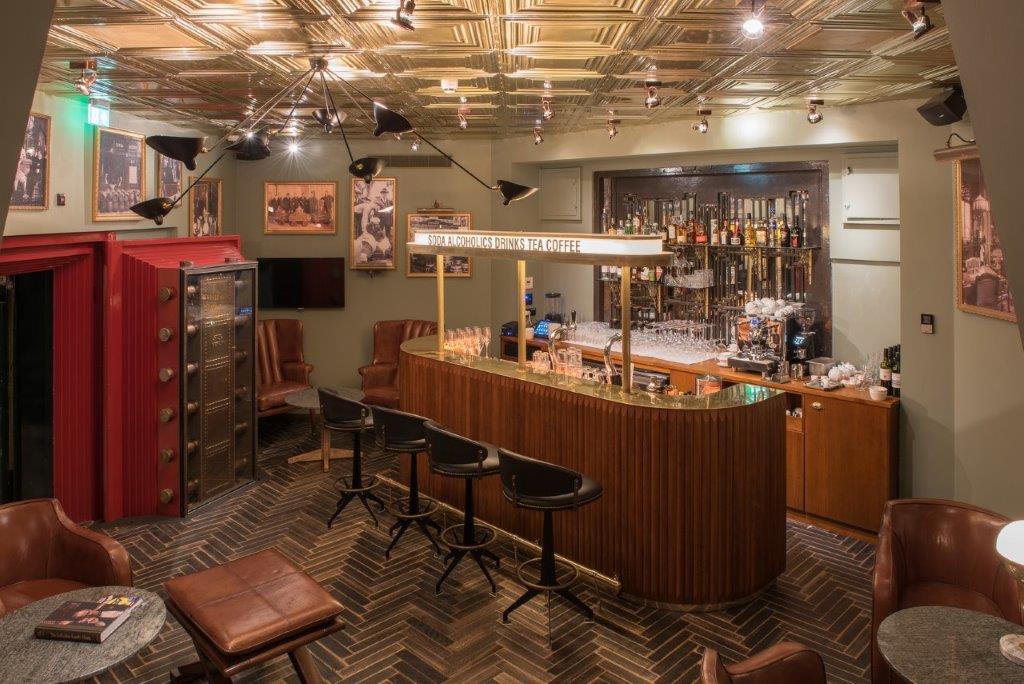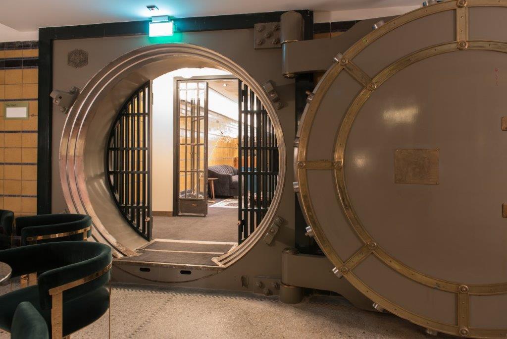 Ook het gebouw zelf was uitgangspunt van het ontwerp. Met historische en architectonische elementen zoals de verschillende marmers, glas, mozaïeken, ornamenten en houtwerk. “Kasten en stalen deuren hebben we hergebruikt, en we hebben de patronen van het oude houtwerk doorgevoerd in de nieuwe interieuronderdelen zoals de deuren en tapijten. Artwork is vooral geïnspireerd op munten en bankbiljetten.” Ook ontwierp het bureau voor elke kamer een multifunctionele stalen kluis die verwijst naar de geschiedenis van het gebouw. Gasten moeten aan het wiel draaien om het te openen. De kluis bevat (uiteraard) een kluis, een minibar, koffie- en theefaciliteiten en opslagruimte.