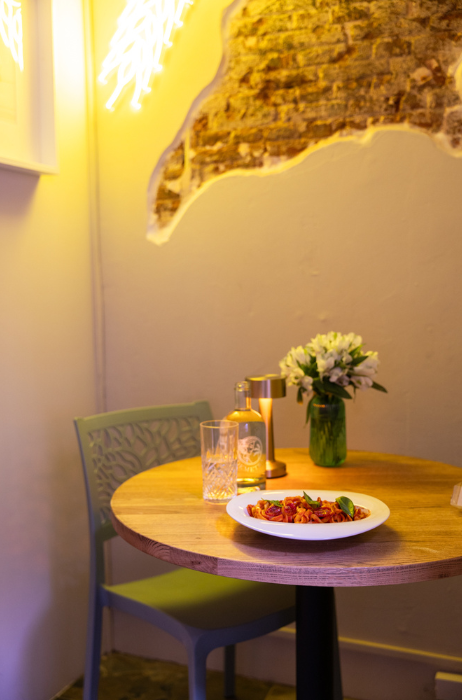 De nieuwe horecazaak bevindt zich in een inhammetje van de bruisende Reguliersdwarsstraat. Op de menukaart staan veel verschillende verse, huisgemaakte Italiaanse gerechten, zoals: burrata met geroosterde groenten en pittige honing, of geschroeide octopus met cannelli puree, straciatella, gekarameliseerde uien en citroen. Bij de primi (altijd iets van pasta) vind je gerechten als: tagliolini van gebrande tarwe met pittige tomatensaus, of gnocchi met gele tomatensaus, stracciatella en krokante guanciale.
