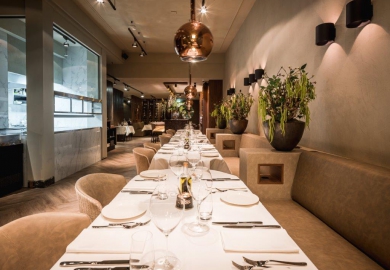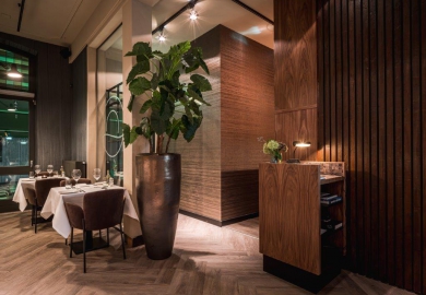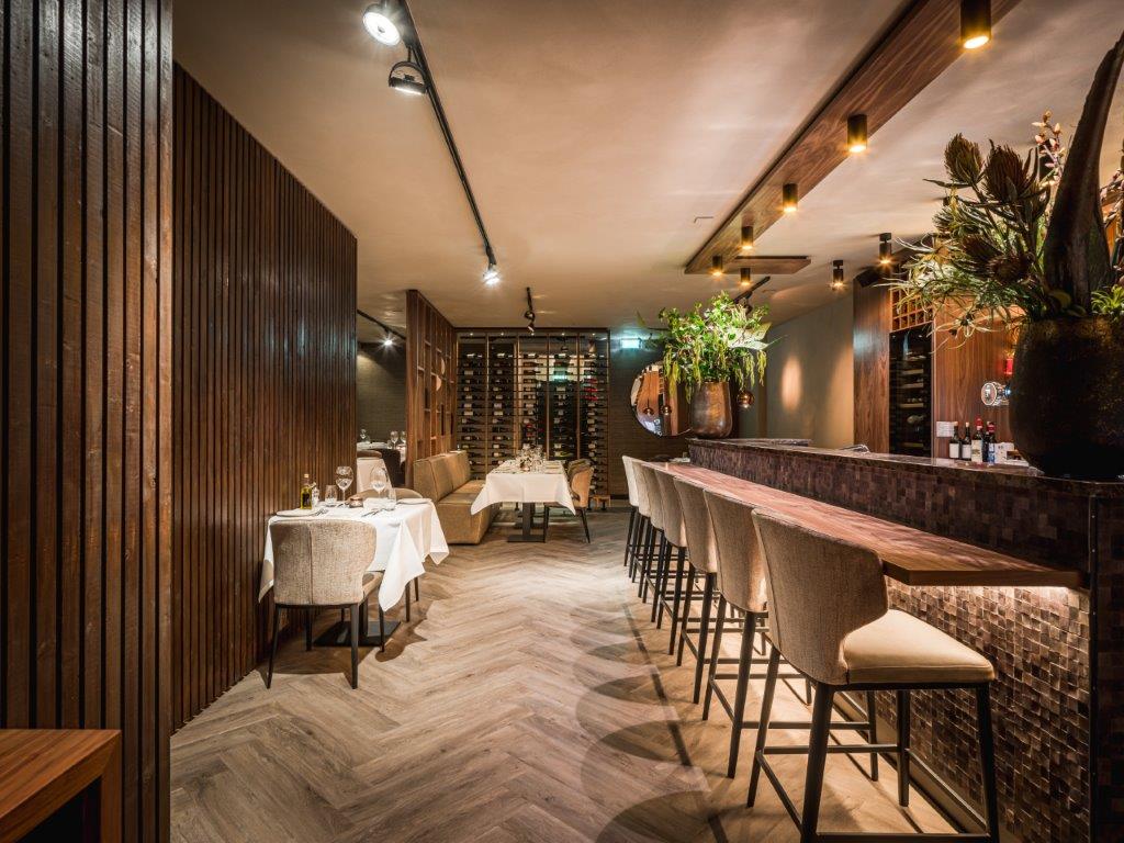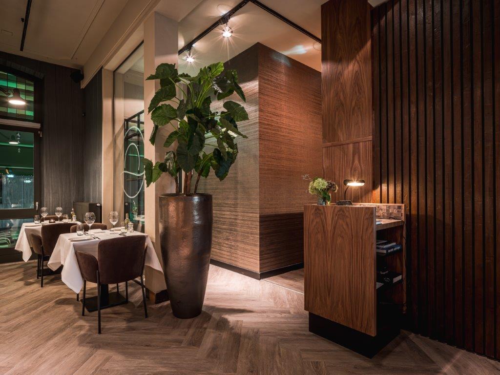 De designer vertelt: “Het moest een luxe uitstraling krijgen, maar niet over de top worden. Daarom koos ik voor een rustige, warme en serene sfeer met niet al te veel verschillende kleuren. De mensen en gerechten geven uiteindelijk kleur aan deze zaak, is mijn mening. De zandachtige taupé-tinten met structuurwanden vormen de basis en ik heb niet meer dan vier kleuren gebruikt. Dat geeft de nodige rust en ruimte.”