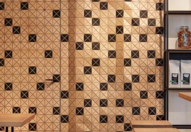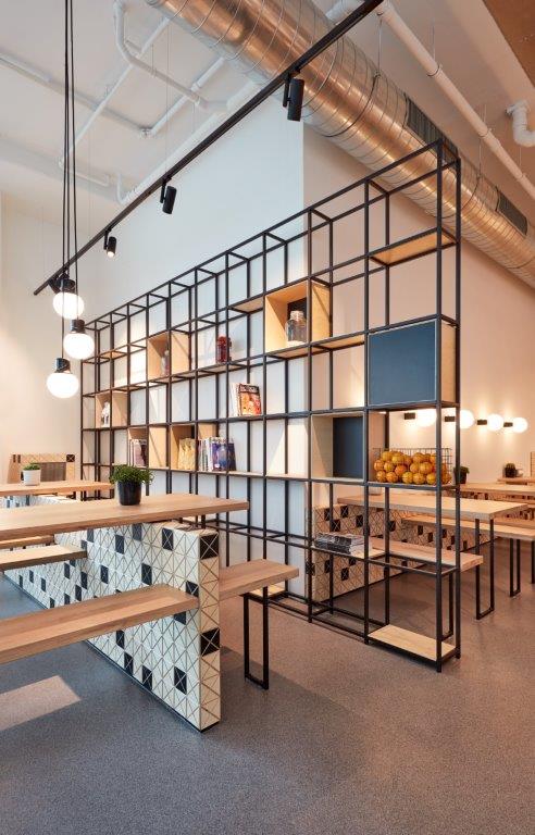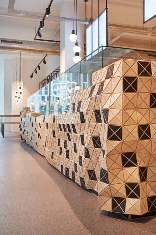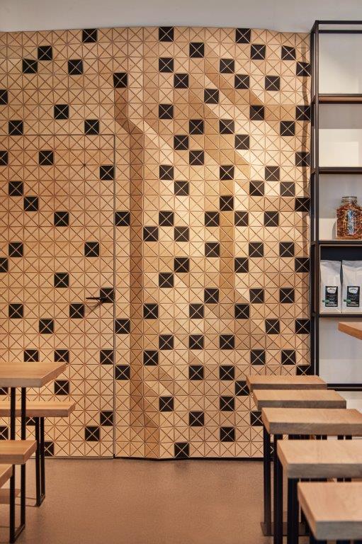 Ten slotte is het iconische Lebkov-patroon ook aanwezig - op een andere schaal - in de open opslagruimte: een modulaire stalen structuur waar verse producten en koffiebonen kunnen worden tentoongesteld in schappen en dozen van Wood-skin, die vrij kunnen worden geplaatst in de stalen frames.