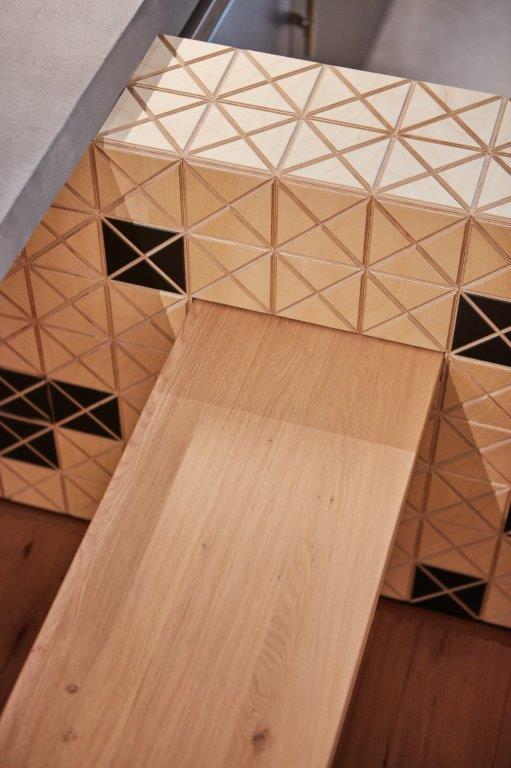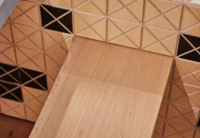 Deze ‘sharing mix’ wordt ook vertegenwoordigd door het Lebkov-patroon waarin zwarte vierkanten zich vermengen met lichtgekleurde vierkanten. Eerder gerealiseerd in bestaande Lebkov zaken met kleine tegels, komt het patroon nu terug met behulp van innovatief materiaal, Wood-skin, houten panelen met gegraveerde patronen. Woodskin vormt zich organisch als bekleding en structuur van de meubels. De zwart-houtbekleding verleent uniformiteit aan de ruimte en creëert verrassende bewegingen in het meubilair en de muren.