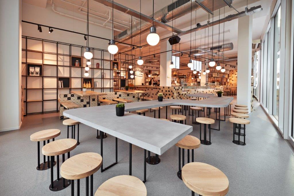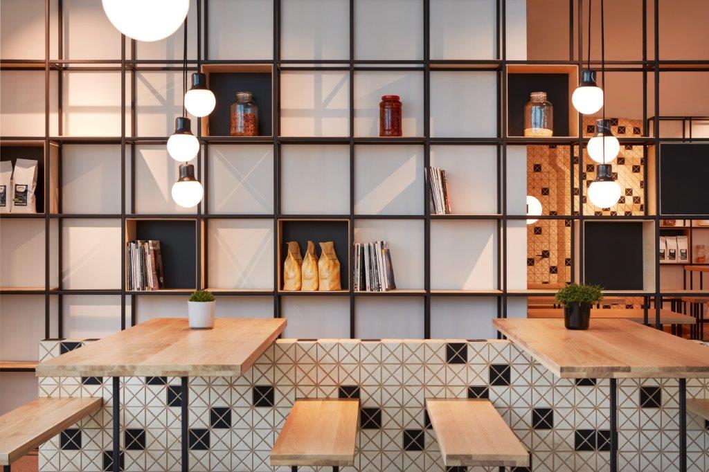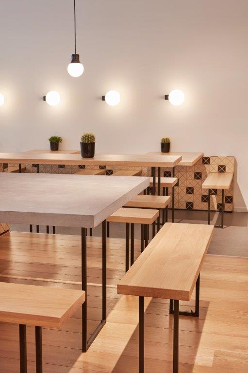 De bar en de open keuken zijn centraal gelegen, de zitgedeeltes zijn daar rondom geplaatst om een speciale plek te creëren waar de gasten plaatsnemen. Op houten banken naast de keuken en de open opslagplaats, langs een slangenachtige gedeelde tafel in beton, aan de bar of op een verhoogd platform waar de betonnen werktafels van de barista over de toonbank worden uitgetrokken en gasten tafels worden. De etenswaren worden gepresenteerd in een lage vitrinekast voor een betere zichtbaarheid van de producten en om de nauwe relatie tussen klant en barista te benadrukken.