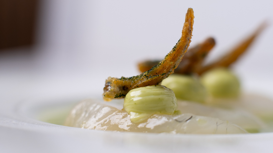 Gerecht met tomaat, rooibos-kombucha, basilicumcrème, sesam-sinaasappel en eikenblad (links) en snoekbaars, snijboon, codium en spiering (rechts)
