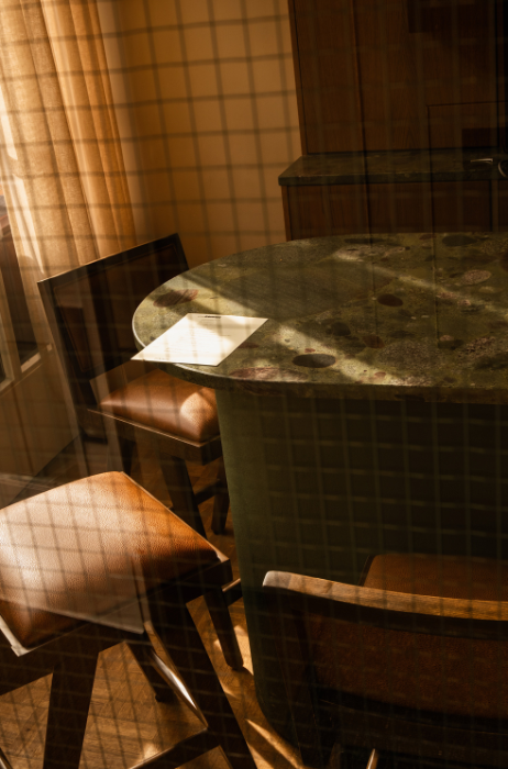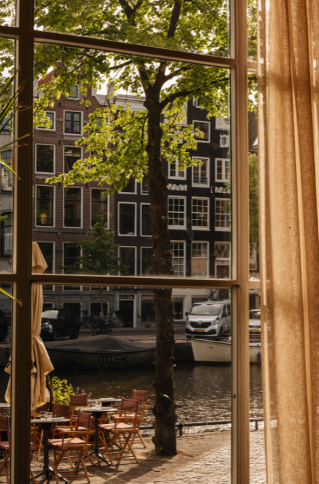 Het interieur is ontworpen door Lisa Boissevain van Investerior (o.a. bekend van Williams) en doet denken aan de woonkamer van een kunstverzamelaar. Eclectische kunst aan de muren en natuurlijke materialen creëren een intieme sfeer. De open keuken vormt het hart van de zaak, waar gasten direct aan de keukenbar plaatsnemen en bediend worden door de chefs zelf. In de zomer is er een zonnig terras aan de gracht.