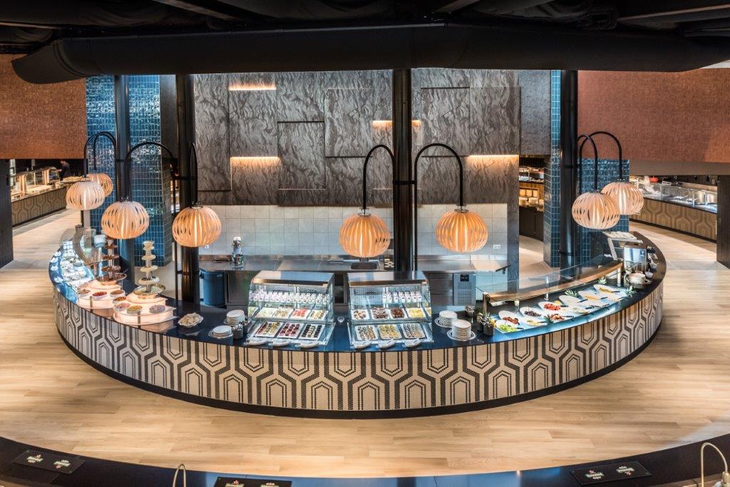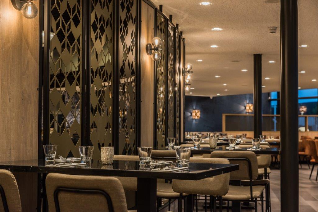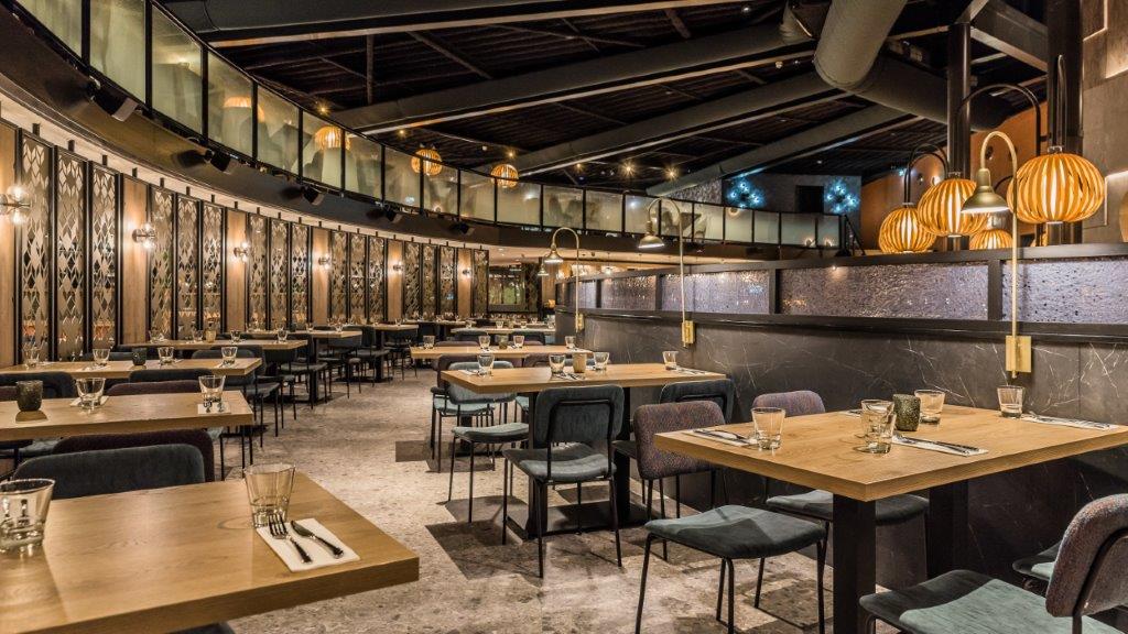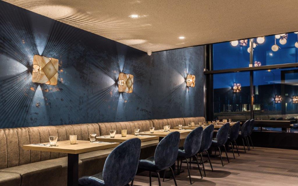 Ze vervolgen: “Die scheidingswanden beneden en de ruime opstelling van meubilair zorgen voor de juiste sfeer, terwijl boven op de entresol genoten kan worden van een spectaculair uitzicht over het restaurant.” Boven de buffetten en aan de balustrades hangen verder sierlijke op maat gemaakte stalen armaturen met grote lampen van houtfineer. LuckyApple.nl