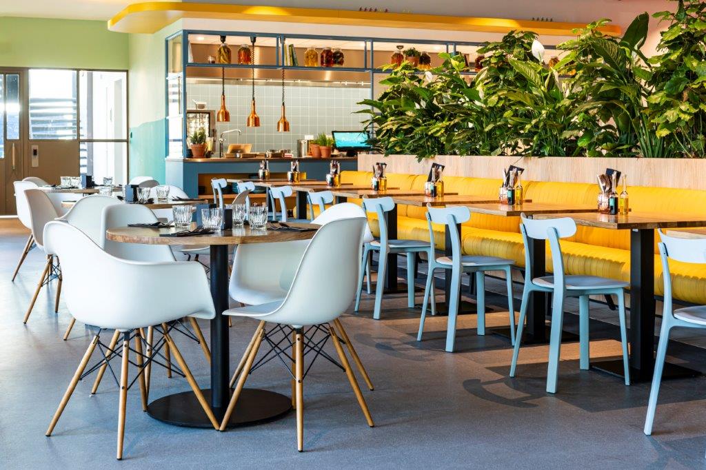 Madame Cyclette zit de begane grond van het onlangs geopende Move Experience Centre. Er zijn 80 zitplekken in het kleurrijke restaurant en er is ook een terras.