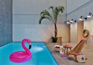Zo zijn de muren gemaakt van zeecontainers en bevinden zich werkende fietspedalen aan de barkrukken. Ook speels: het binnenzwembad met palmbomen en opblaasbare flamingo’s. Verder staat in het hotel - met 120 kamers en de moderne fitnessruimte Athletic Club - verbinden centraal. Dat begint al bij het inchecken. Dit vindt niet plaats bij een receptie, maar aan de bar. Hier worden gasten verwelkomd met de signatuurcocktail Got Moxy. Opvallend is verder de paarse verlichting aan de buitenkant.