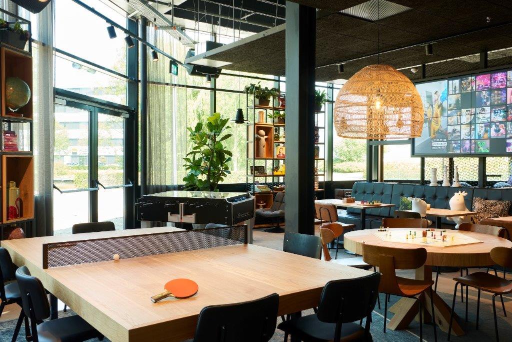 In het interieur van hotel Moxy Amsterdam Schiphol Airport vormen spellen, fotoboeken, een tafeltennistafel en een heuse klimwand het decor. “Met die inrichting hopen we dat onze gasten veel tijd in de publieke ruimtes doorbrengen om bijvoorbeeld iets te eten, drinken of zelfs te werken”, zegt general manager Bart Pastoor.